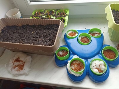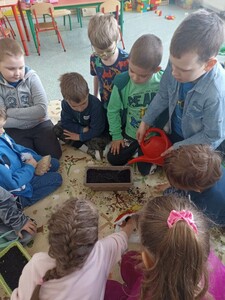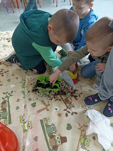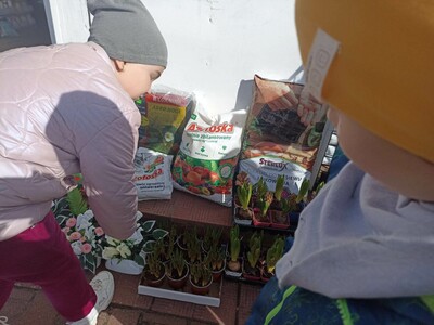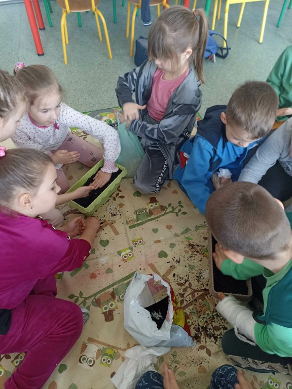 Wraz z nadejściem wiosny dzieci z grupy przedszkolnej „0A” założyły w sali zielony ogródek. Zgromadziły potrzebne doniczki, ziemię, nasiona i sadzonki roślin cebulowych. W tym celu wybrały się do sklepu ogrodniczego, aby zakupić potrzebne rzeczy. Przed przystąpieniem do pracy poznały warunki potrzebne roślinom do wzrostu, etapy ich wzrostu oraz zasady pielęgnacji. Dzieci będą mogły teraz obserwować efekty swojej pracy, pamiętając jednocześnie o podlewaniu posianych i posadzonych roślin. Działania dzieci związane są z realizacja projektu ekologiczno- przyrodniczego „ Gramy w zielone”.