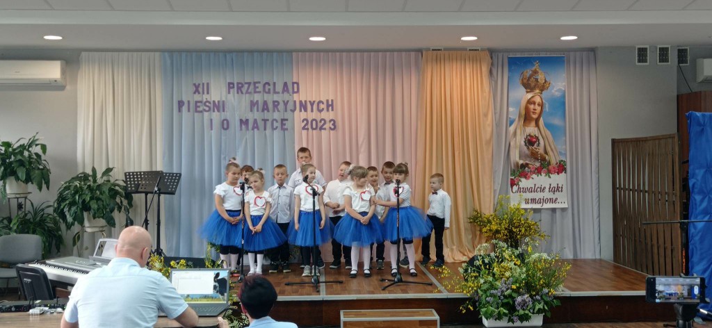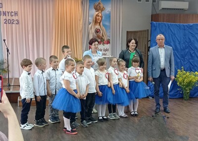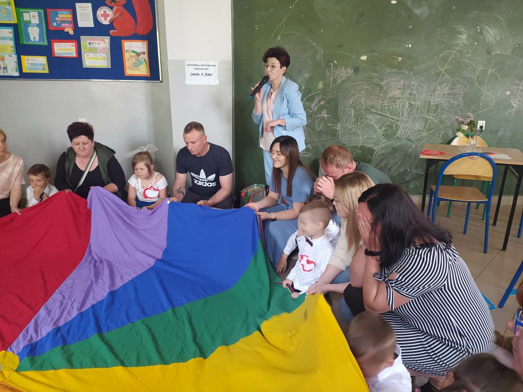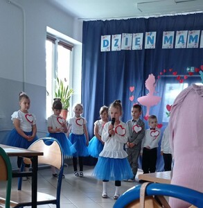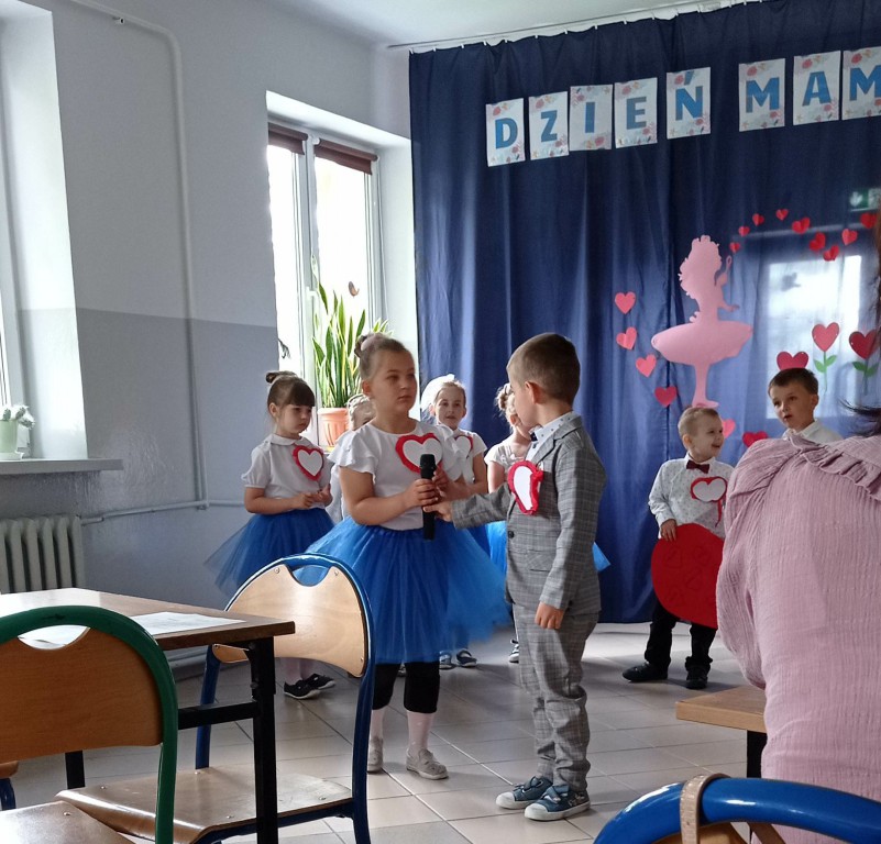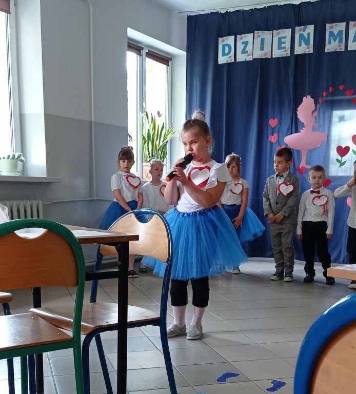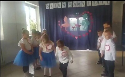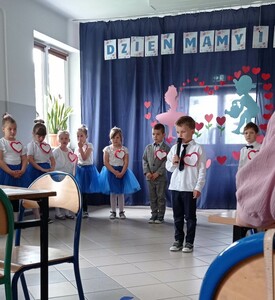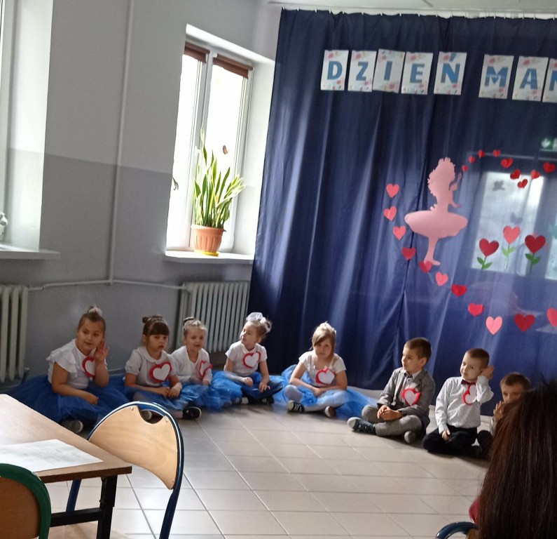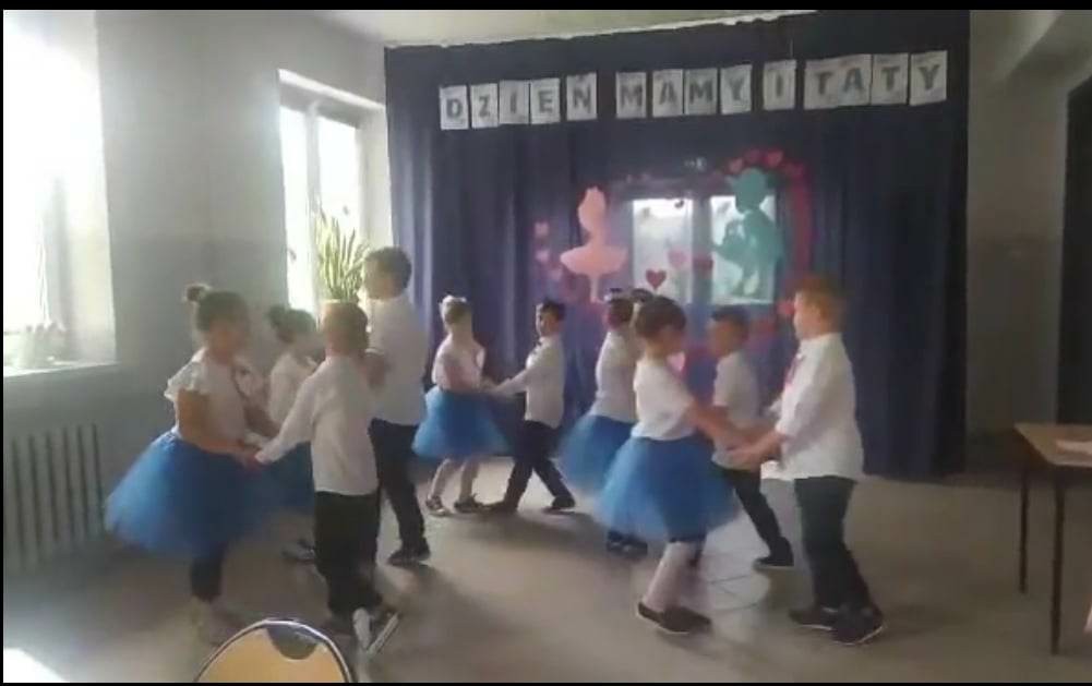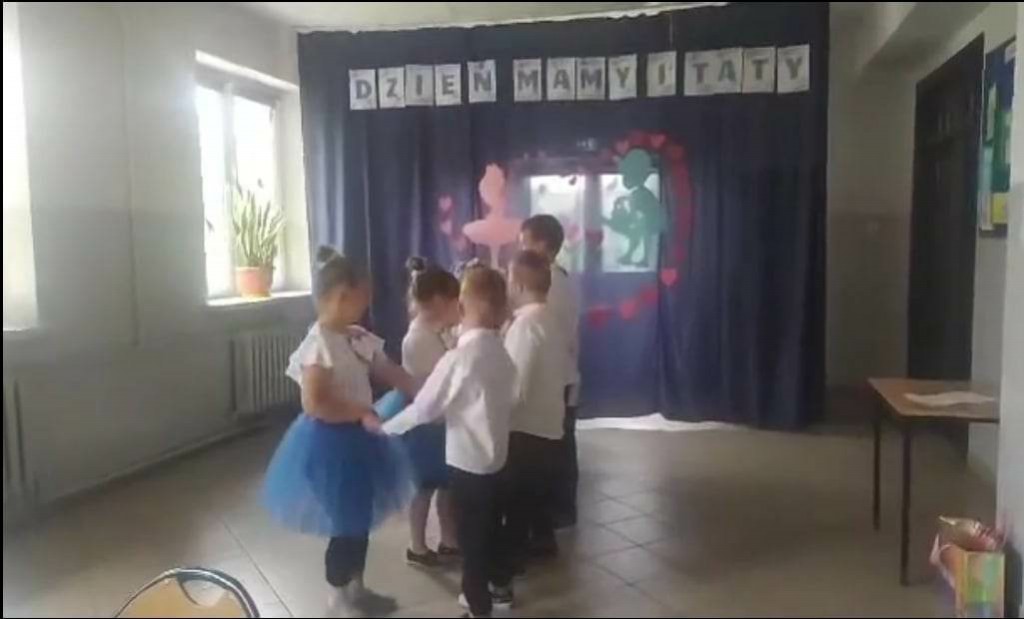 Dzieci z grupy 0”A” zaprezentowały swoim rodzicom układ taneczny w rytmie cza-cza, którym wprowadziły w nastrój uroczystości. Następnie w wierszu i w piosence przekazywały słowa pełne miłości dla Mamy i Taty wskazujące, że zawsze są blisko, że zawsze mogą liczyć na ich uśmiech i wsparcie, że świat z nimi jest piękny i ciekawy. Dzieci złożyły również obietnice, że nigdy nie będą zasmucać rodziców swoim zachowaniem. W ramach podziękowania wręczyły własnoręcznie wykonane serca ze słowami „ Kocham Was” i rysunkiem rodziny. Po części uroczystej rodzice włączyli sie do wspólnej zabawy z chustą animacyjną, a następnie udaliśmy się jeszcze na Przegląd Pieśni Maryjnych i o Matce do GOK w Wielgomłynach. Tam zaprezentowały dzieci piosenkę „ Dam Mamie serce” zdobywając III miejsce.