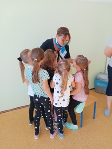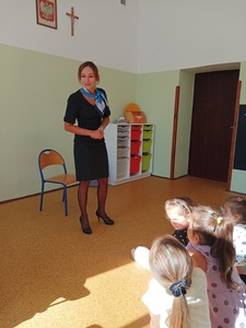 Pani Ania opowiedziała dzieciom, co należy zrobić, aby zostać stewardessą. Omówiła zadania, które musi wykonywać na pokładzie samolotu. Dzieci mogły zobaczyć jak wygląda ubranie osoby pracującej w Polskich Liniach Lotniczych LOT. Jakie są wymogi odnośnie obuwia, fryzury i w przypadku kobiet makijażu. Nasz gość zwrócił uczniom szczególną uwagę na znajomość języków obcych, zwłaszcza języka angielskiego, która jest niezbędna do pracy w tym zawodzie. Opowiadała dzieciom, że praca w samolocie nie jest wcale łatwa, ale daje bardzo dużo satysfakcji. Ogromnym atutem jest zobaczenie wielu wspaniałych miejsc na świecie, o których również opowiedziała swoim małym słuchaczom. Na koniec pani stewardessa zachęciła wszystkich do wycieczki samolotem.