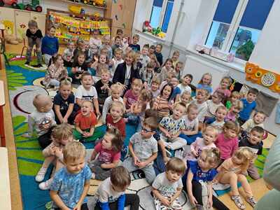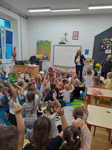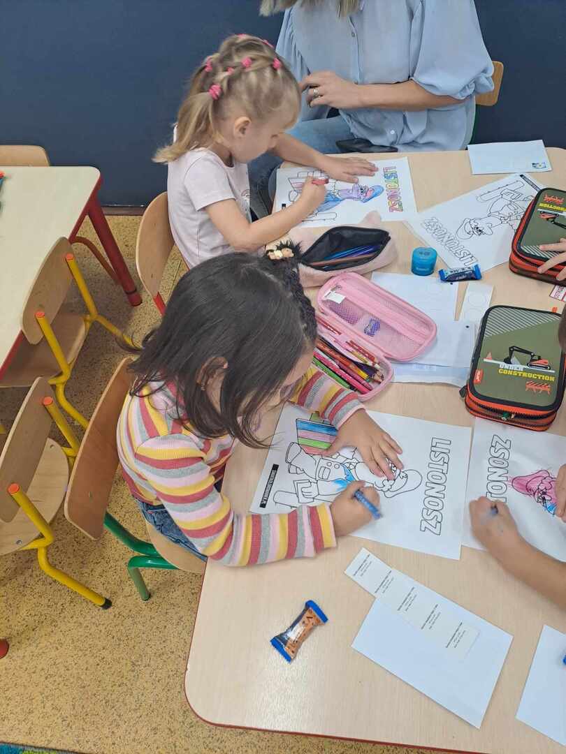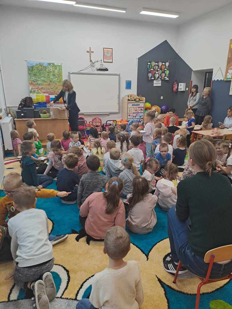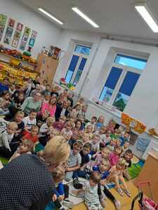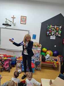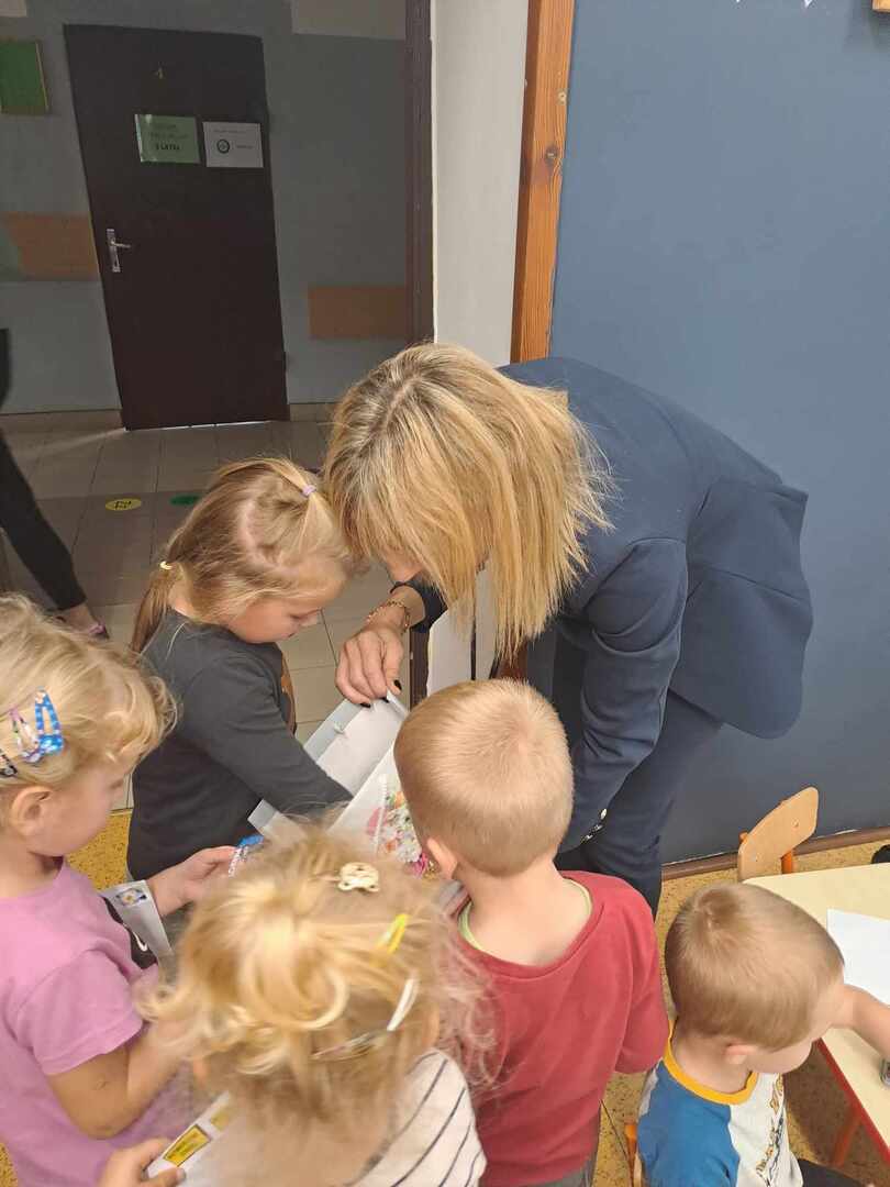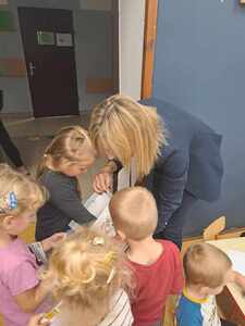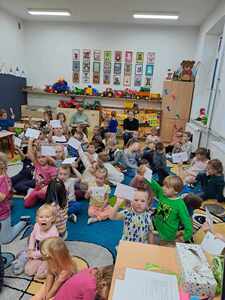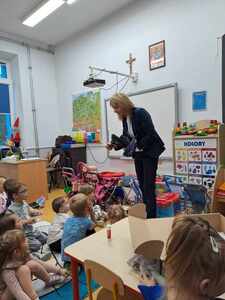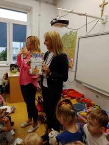Dzieci otrzymały za aktywny udział w spotkaniu pamiątkowe naklejki, malowanki oraz słodkie niespodzianki. Na zakończenie spotkania oraz w ramach podziękowania wręczyliśmy pani Sylwii dyplom od wszystkich oddziałów przedszkolnych. Wizyta ta była dla dzieci olbrzymim przeżyciem, ponieważ nic tak nie zaznajamia dziecka z danym środowiskiem, jak możliwość obejrzenia go na żywo. Serdecznie dziękujemy za przemiłe spotkanie.