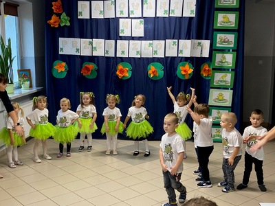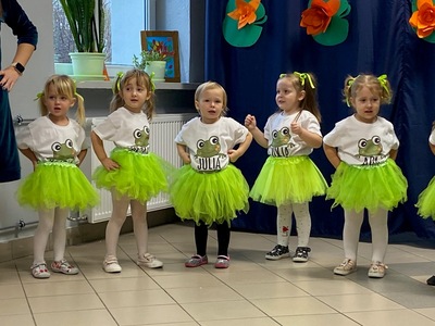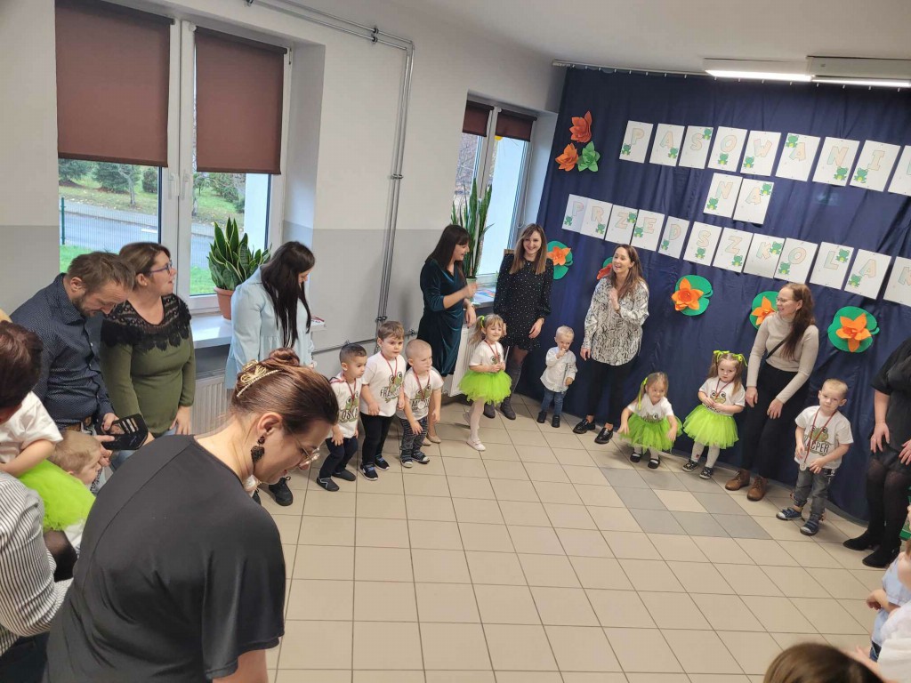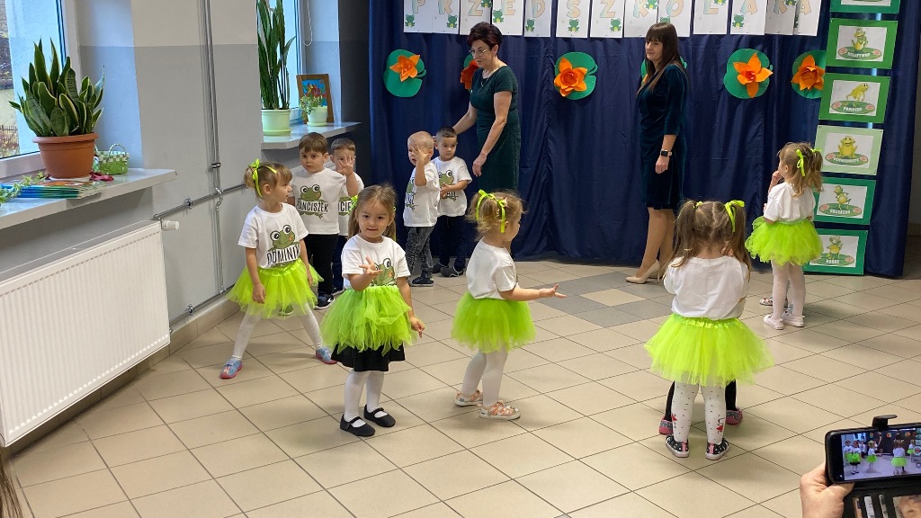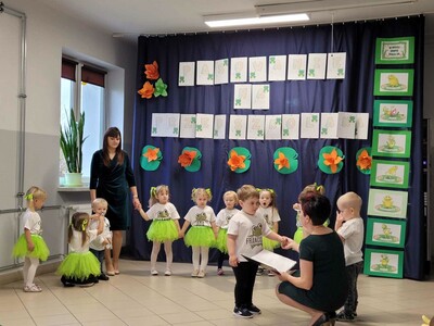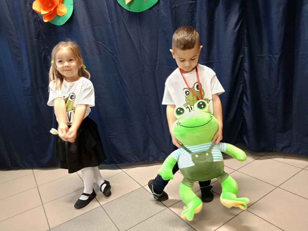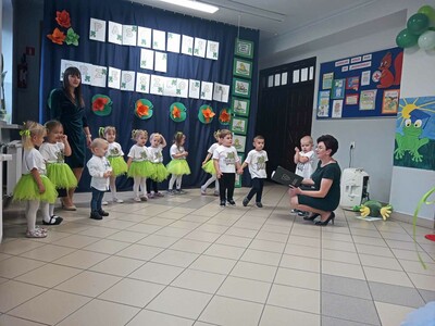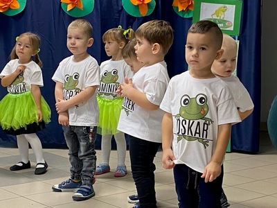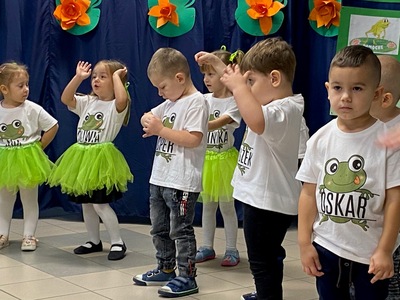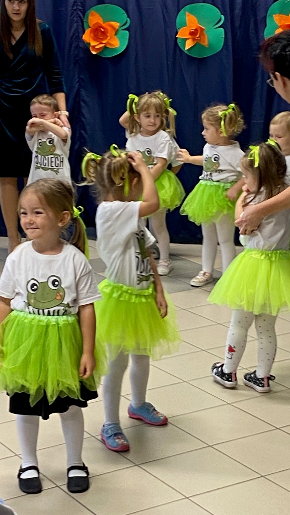 „Żabki czyli nasze 3-latki pięknie śpiewały, tańczyły , mówiły wiersze. Były również bardzo odważne, chociaż był to ich pierwszy występ przed tak liczną publicznością. Wszyscy byliśmy bardzo dumni z ich osiągnięcia. Dyrektor P. Leszek Wróblewski uroczyście nałożył dzieciom medale Wzorowego Przedszkolaka oraz wręczył pamiątki i dyplomy. Na uroczystości gościli również ich starsi koledzy z klasy „0”B, którzy wraz ze swoją Wychowawczynią powitali ich wierszykiem w gronie przedszkolaków. Zdjęcia i nagrania będą przypominać ten ważny moment, kiedy dzieci wkraczają na tą ścieżkę wielu wyzwań, drogę ku samodzielności, rozwoju umiejętności tak cennych i potrzebnych w życiu-
