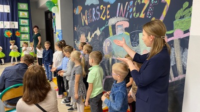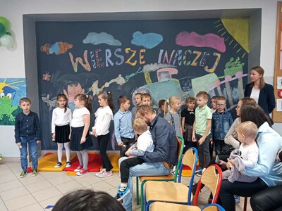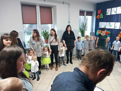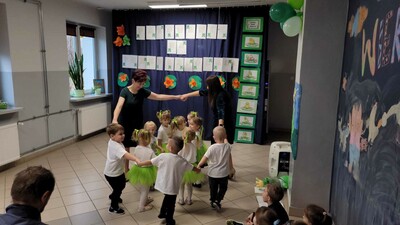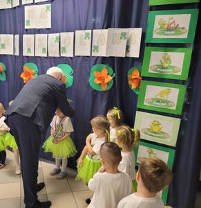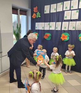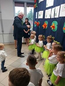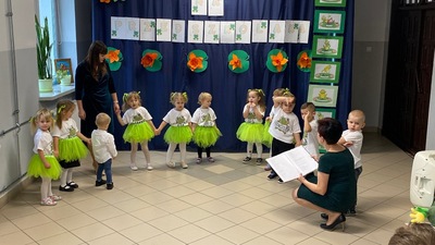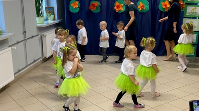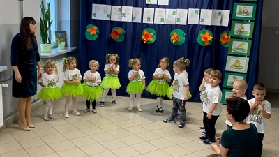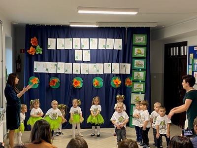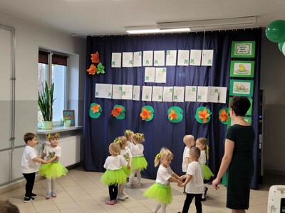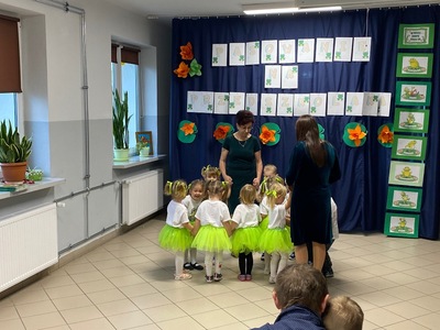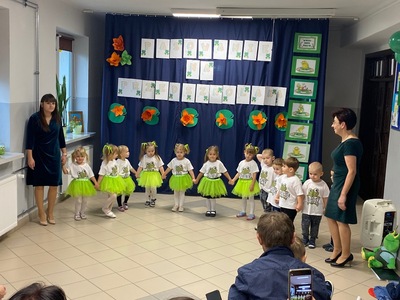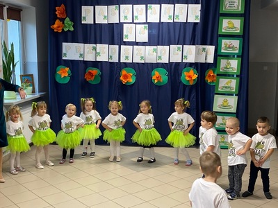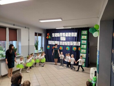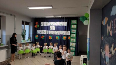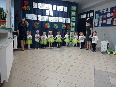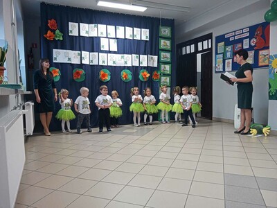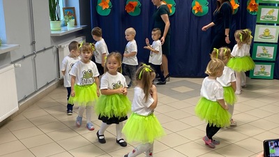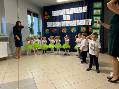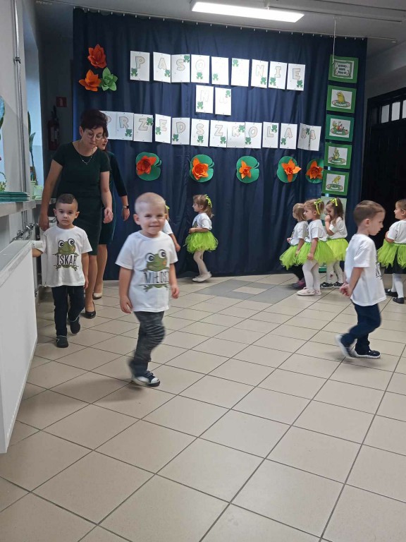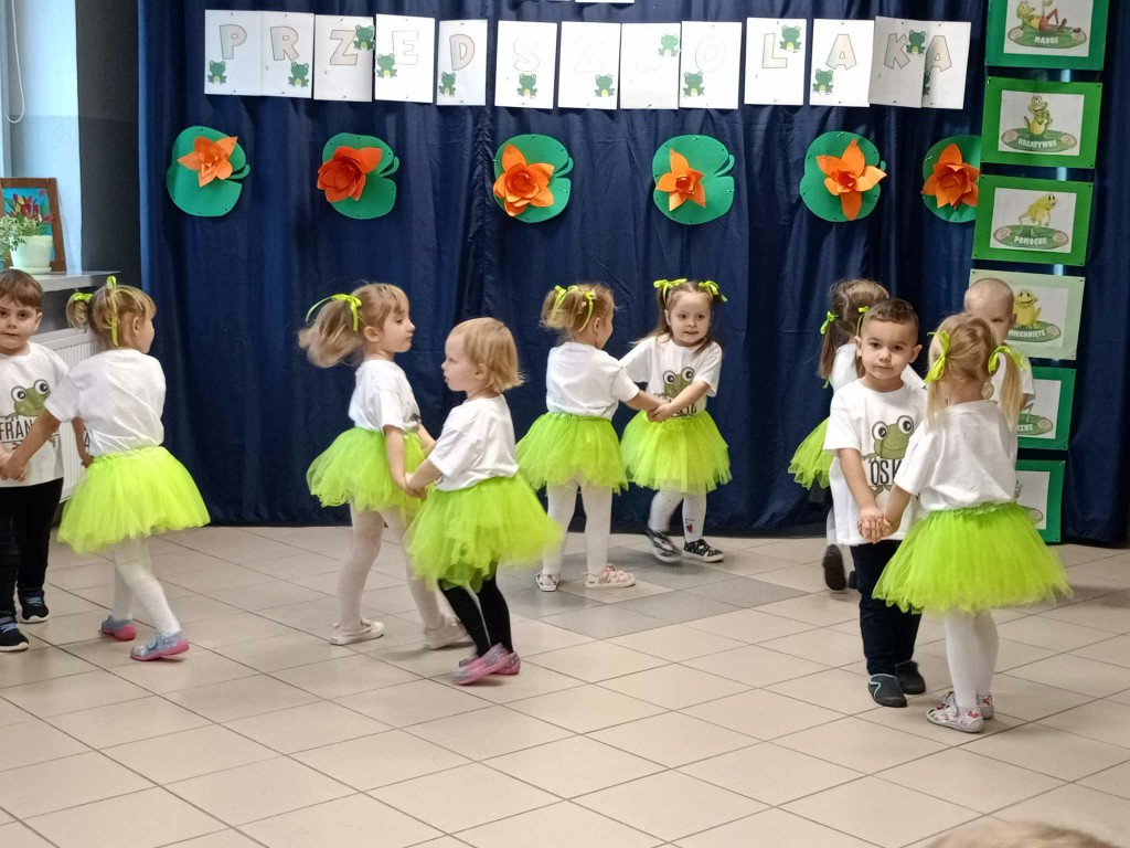 „Żabki czyli nasze 3-latki pięknie śpiewały, tańczyły , mówiły wiersze. Były również bardzo odważne, chociaż był to ich pierwszy występ przed tak liczną publicznością. Wszyscy byliśmy bardzo dumni z ich osiągnięcia. Dyrektor P. Leszek Wróblewski uroczyście nałożył dzieciom medale Wzorowego Przedszkolaka oraz wręczył pamiątki i dyplomy. Na uroczystości gościli również ich starsi koledzy z klasy „0”B, którzy wraz ze swoją Wychowawczynią powitali ich wierszykiem w gronie przedszkolaków. Zdjęcia i nagrania będą przypominać ten ważny moment, kiedy dzieci wkraczają na tą ścieżkę wielu wyzwań, drogę ku samodzielności, rozwoju umiejętności tak cennych i potrzebnych w życiu-
