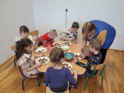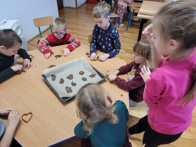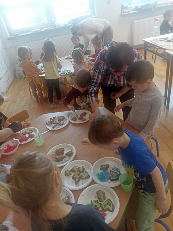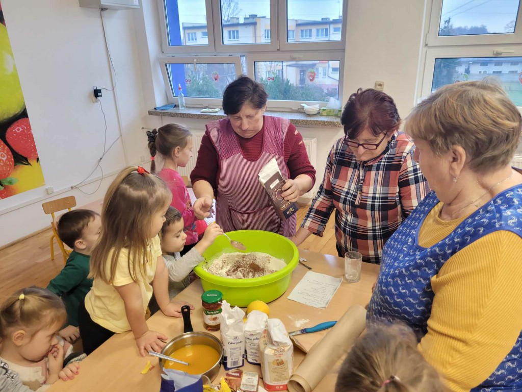 Grupy przedszkolne realizujące ogólnopolski projekt społeczno- edukacyjny „Łączymy pokolenia: Seniorzy dzieciom- dzieci seniorom” zorganizowały warsztaty pieczenia pierniczków. Odbyły się one przy współpracy i zaangażowaniu Pań z KGW Trzebce. Spotkanie miało świąteczny charakter. W rozmowie z Paniami nawiązaliśmy do tradycji i zwyczajów bożonarodzeniowych kultywowanych w naszych domach. Dzieci z ogromną przyjemnością poznawały tajniki udanych wypieków. Chętnie uczestniczyły w przygotowywaniu ciasta, następnie w wykrawaniu różnorodnych kształtów oraz w dekorowaniu pierniczków. Każdy miał swój własny pomysł na ich ozdobienie, a efekt był bardzo zadawalający.
