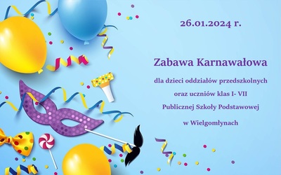 Zabawa Karnawałowa dla dzieci oddziałów przedszkolnych oraz uczniów klas I-III oraz IV- VII Publicznej Szkoły Podstawowej w Wielgomłynach odbędzie się w dniu 26.01.2024 r (piątek) w hali sportowej.