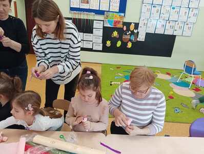 Święta Wielkanocne są bardzo radosnym czasem, na który z utęsknieniem czekają zarówno dzieci jak i dorośli. W tym czasie w naszej szkole nadszedł czas świątecznych przygotowań i dekoracji. Właśnie z tej okazji we wtorek 19 marca w zerówce odbyły się warsztaty, na które przybyły mamy i babcie naszych przedszkolaków. Dzięki wiedzy i umiejętnościom naszych gości dzieci nauczyły się wykonywać świąteczne ozdoby. Poznały również tradycje związane z tym radosnym czasem. Wspólnie spędzone chwile sprzyjały integracji, pogłębiały wiedzę przedszkolaków, pozwoliły w praktyczny sposób zdobywać nowe wiadomości.