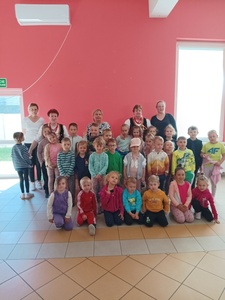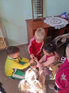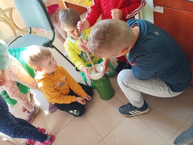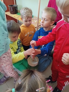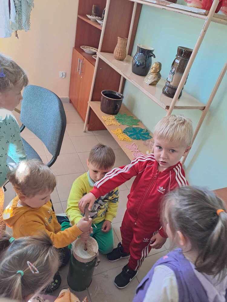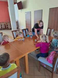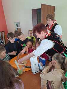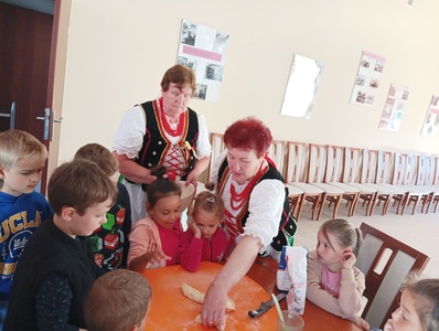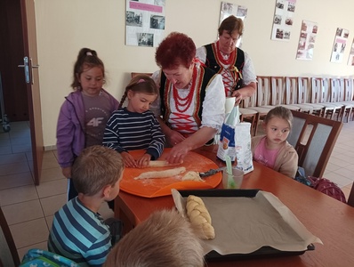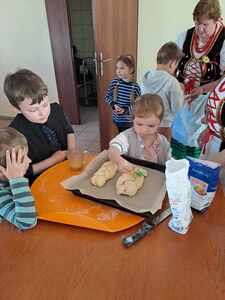 Po obejrzeniu izby ludowej zostaliśmy zaproszeni na warsztaty z pieczenia chałki drożdżowej. Dzieci wspólnie z paniami mogły zagniatać ciasto, pleść warkocza z ciasta, smarować je oraz wyrabiać i posypywać kruszonką. Kiedy nasze wypieki były już gotowe przedszkolaki ze smakiem zjadły swój wypiek z masłem, dżemem lub cukrem.