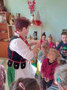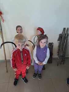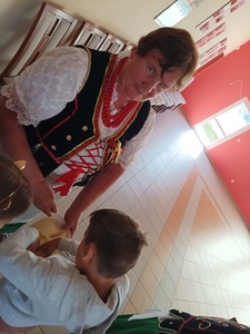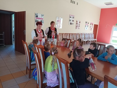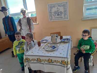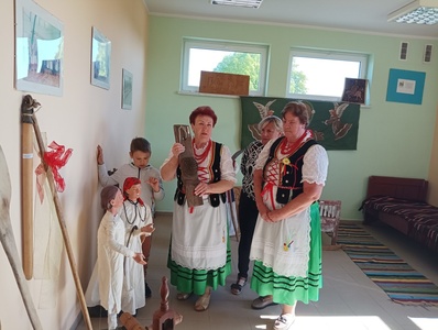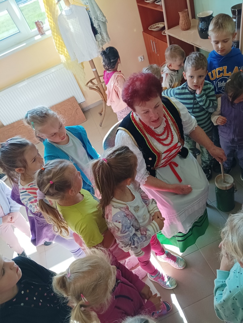16 maja dzieci z zerówki oraz grupy 4-latków, wybrały się na wycieczkę do Zagórza. W Zagórzu na przedszkolaków czekały w pięknych strojach ludowych Panie Z KGW Zagórzanki. Dzieci wspólnie z nimi udały się do izby ludowej w której znajdowały się przedmioty z życia codziennego z dawnych czasów. Miejsce to zrobiło na każdym ogromne wrażenie. Panie Z KGW opowiedziały nam jak wyglądało życie dawniej, do czego służyły przedmioty znajdujące się w izbie ludowej. Dzieciom bardzo podobało się darcie pierza oraz ubijanie masła. Każde chciało spróbować i zobaczyć jak taka czynność przebiegała. Przedszkolaki nauczyły się również liczyć na liczydle.