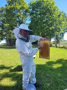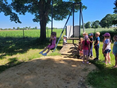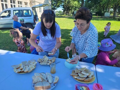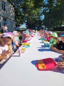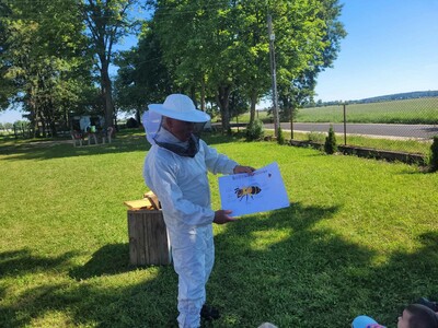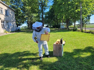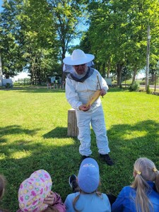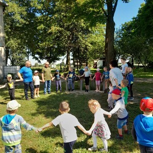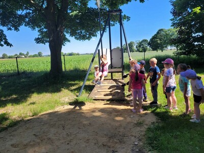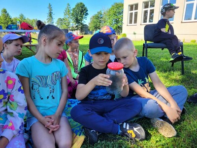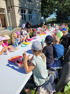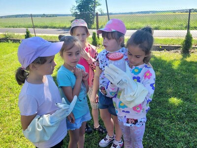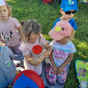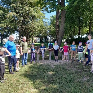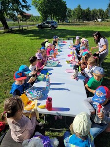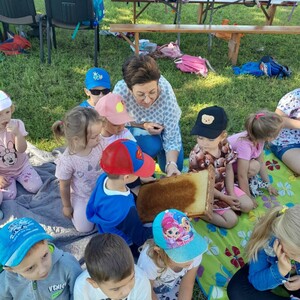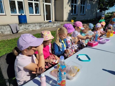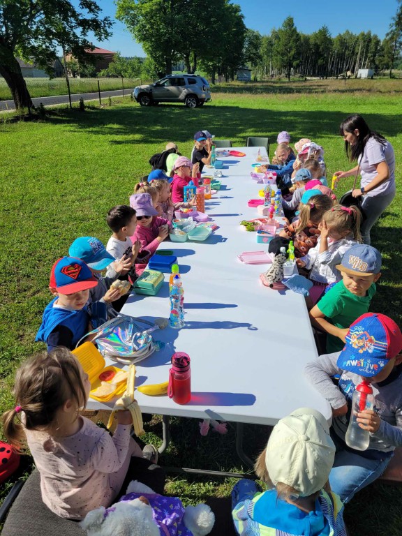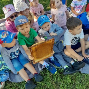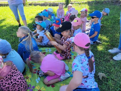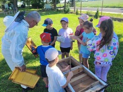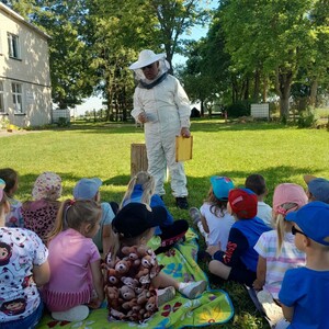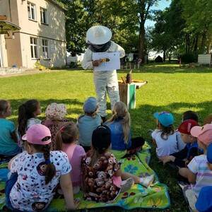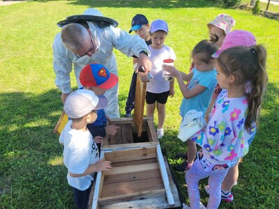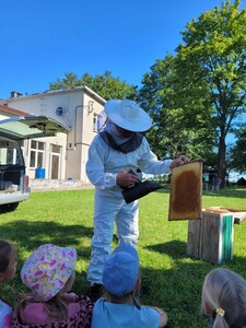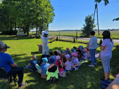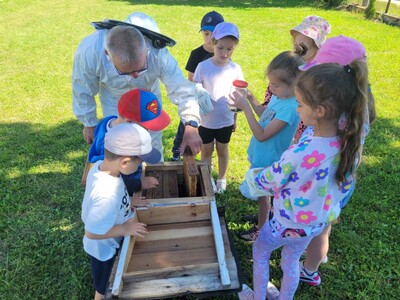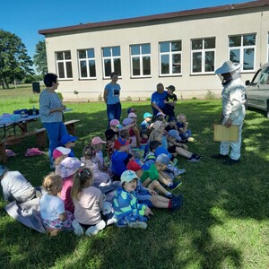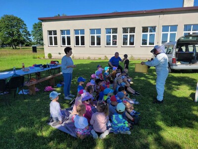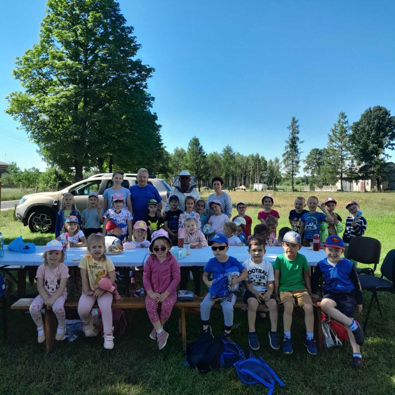 Dzieci z grupy 3-latków oraz kl. 0B uczestniczyły w wycieczce do Myśliwczowa, która została zorganizowanej przy współpracy Stowarzyszenia Zawsze Razem. Na terenie dawnej szkoły odbyły się dla dzieci zajęcia z Panem Jackiem Majcherkiem, od młodych lat pasjonującym się pszczelarstwem. Pan Jacek przybył z wieloma atrybutami potrzebnymi do zbioru miodu. Były pszczoły, strój pszczelarza, podkurzacz, prawdziwy ul. Przedszkolaki poznały wiele ciekawostek z życia pszczół, ich fascynujący świat, a przede wszystkim mogły podziwiać je na żywo. Dzieci poznały etapy rozwoju pszczoły, dowiedziały się, jaką rolę w ulu pełni królowa, robotnice, kim jest truteń, jak i gdzie pszczoły przenoszą pyłek kwiatowy oraz jak powstaje miód. Przedszkolaki miały możliwość zobaczenia niektórych narzędzi niezbędnych w pracy pszczelarza, a chętne dzieci mogły nawet wcielić się w jego rolę. Najważniejszym przesłaniem warsztatów było uświadomienie najmłodszym, jak ważne jest istnienie pszczół dla ludzi. Cenna wiedza przekazana dzieciom może zaowocuje kiedyś już w ich dorosłym życiu pasją do pszczół. Po zajęciach zostały dla dzieci przygotowane pyszne kanapki z miodem z pasieki naszego gościa.