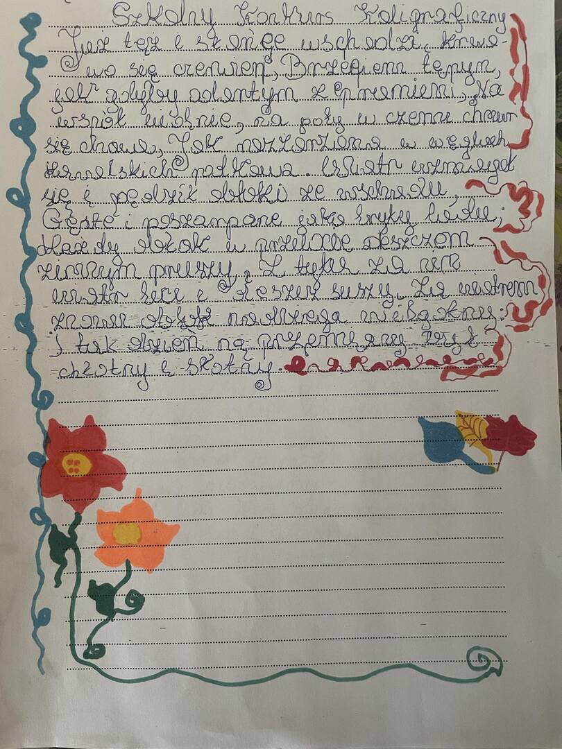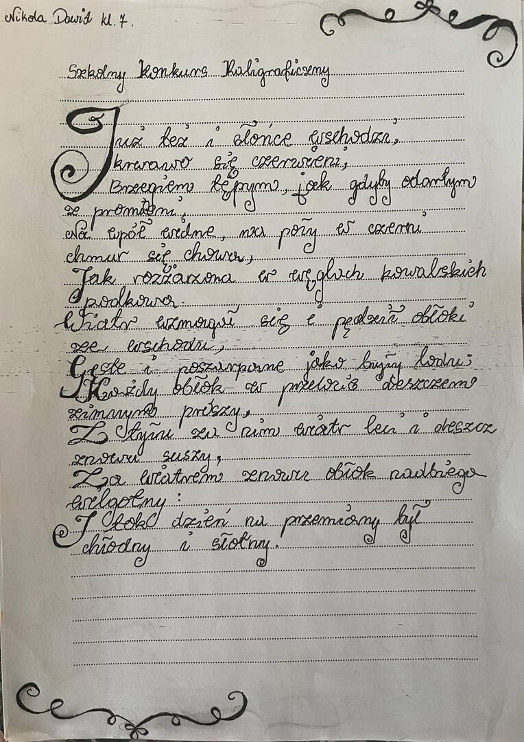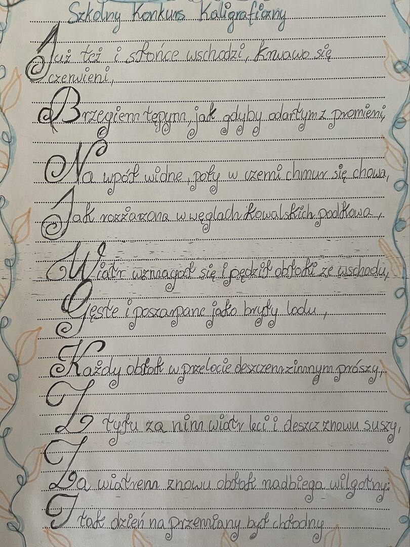 W naszej szkole uczniowie klas 4-7 zmierzyli się z trudną sztuką kaligrafii. Konkurs na najładniej napisany tekst dodatkowo ozdobiony ramką i inicjałem wyłonił cztery zwyciężczynie. Laureatki konkursu otrzymały dyplomy i nagrody książkowe. Mamy nadzieję, że zachęci to naszych uczniów do rozwijania umiejętności ładnego pisania.