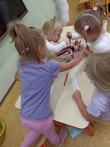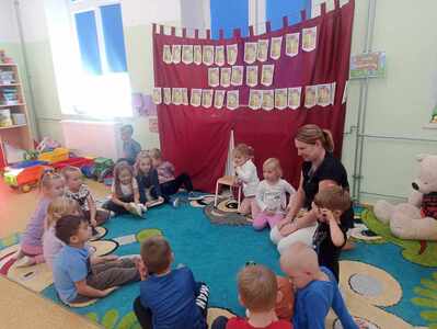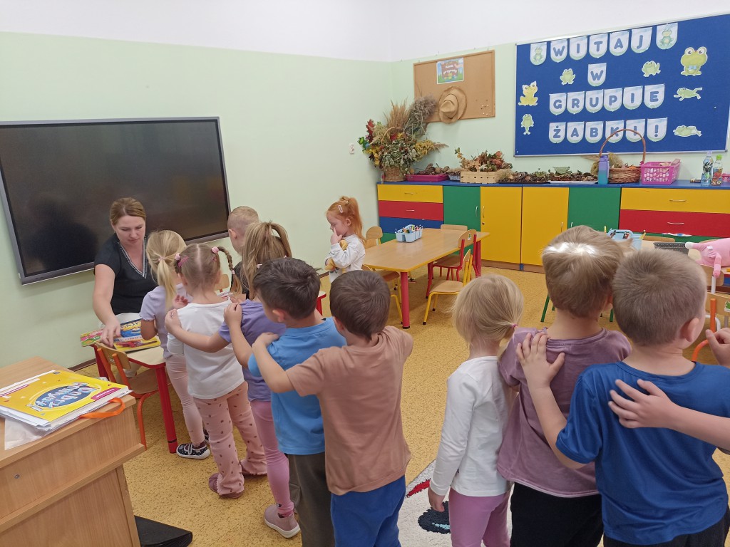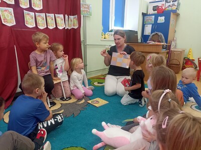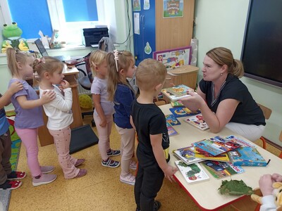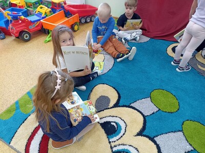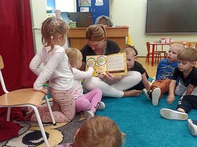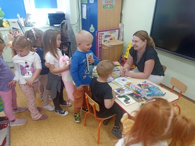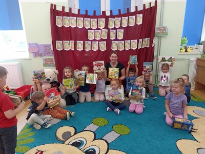 Grupa 4-latków miała możliwość aktywnego uczestnictwa w Ogólnopolskim Dniu Głośnego Czytania z udziałem GBP w Wielgomłynach. Przedszkolaków odwiedziła Pani Paulina Dziębor, która pracuje w bibliotece i zajmuje się upowszechnianiem czytelnictwa wśród dzieci i dorosłych. Spotkanie miało na celu propagowaniem idei głośnego czytania. oraz zachęcenie dzieci do częstego odwiedzania biblioteki wraz z rodzicami. Była to też okazja do wysłuchania przygód bohatera bajkowego Fenka i rozmowy na temat zasad wypożyczania książek.