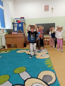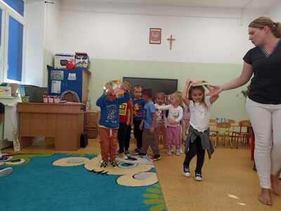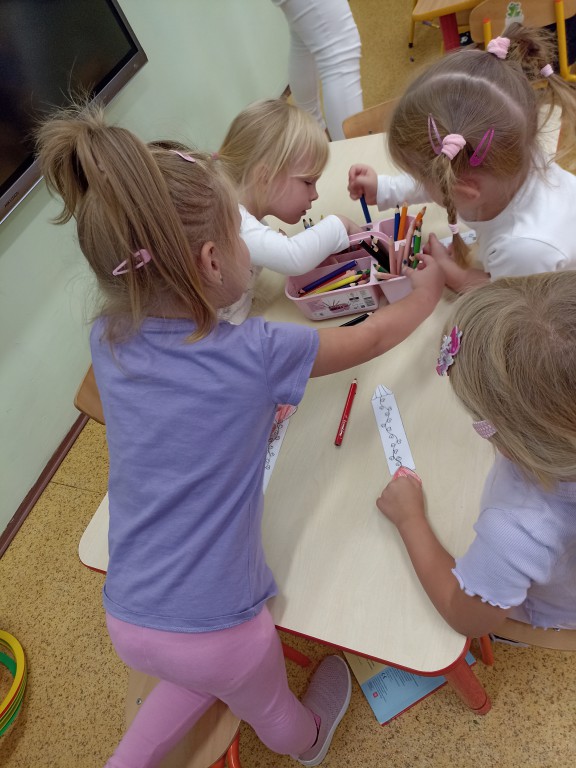 Dzieci przyniosły również na zajęcia swoje ulubione książeczki i wykonały do nich zakładki. Swoją wiedzę mogły utrwalić podczas zabawy tematycznej, w której wcielały się w role wypożyczających. oraz poćwiczyć swoją sprawność z książką na głowie.