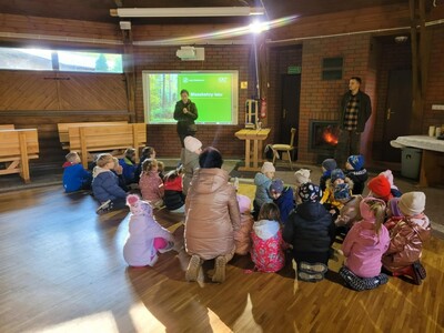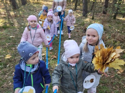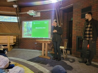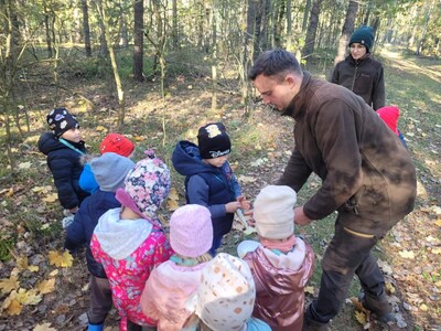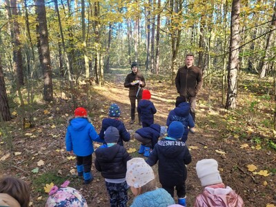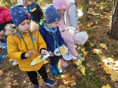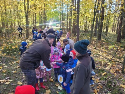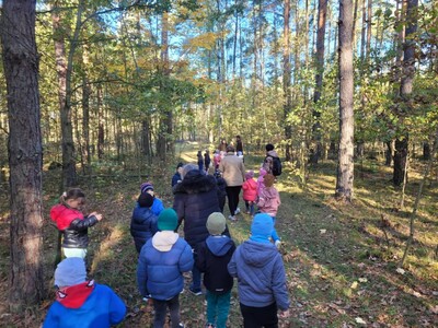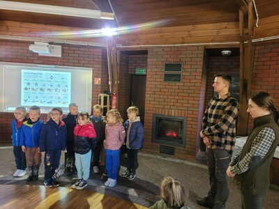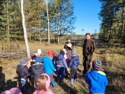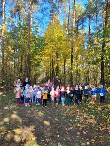 Przedszkolaki z grupy 3, 4-latków oraz klasy 0A uczestniczyły w wycieczce do Osady Łowieckiej w Bysiowie, zorganizowanej w ramach realizacji ogólnopolskiego projektu edukacyjnego „Gramy w zielone”. Dzieci uczestniczyły w zajęciach edukacyjnych prowadzonych przez Nadleśnictwo Przedbórz. Ich celem było poznanie gatunków zwierząt i roślin charakterystycznych dla środowiska leśnego. Edukatorzy podczas spotkanie opowiadali o mieszkańcach lasu, w oparciu o prezentację multimedialną. Dzieci z dużym zaangażowaniem odpowiadały na pytania, rozwiązywały zagadki oraz dzieliły się swoją wiedzą na temat zasad obowiązujących w lesie. Następnie podczas spaceru leśnymi ścieżkami tworzyły jesienne medaliony, dające zróżnicowane wrażenia dotykowe i wzrokowe. Zadaniem dzieci było bowiem odnalezienie czegoś kolorowego, kłującego, miękkiego i twardego i przyklejenie na swoich medalionach. Znalazł się więc na nich zróżnicowany materiał przyrodniczy: kolorowe liście, igły sosny, patyczki, kora, mech, szyszki będący wyjątkową pamiątką po wizycie w lesie.