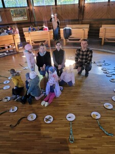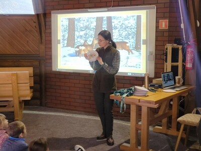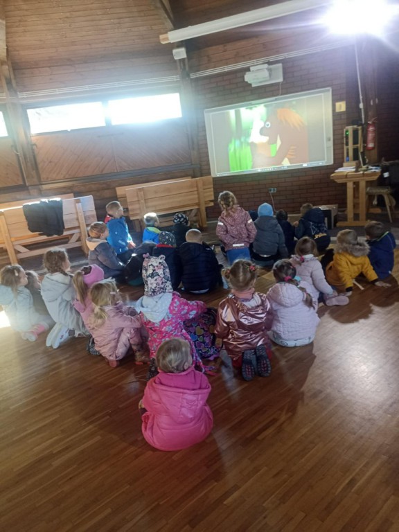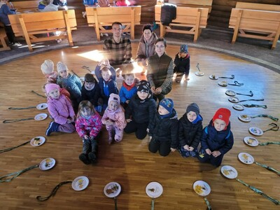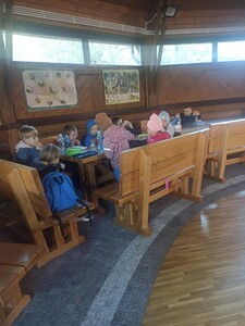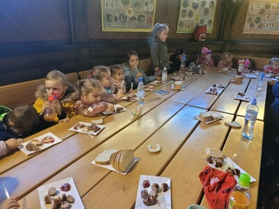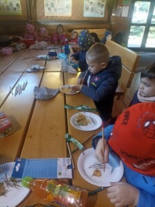 Podczas pobytu w Bysiowie był też czas na posiłek, chwilę odpoczynku podczas oglądania bajki o leśnych zwierzętach oraz aktywności stolikowe- kolorowanie.