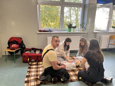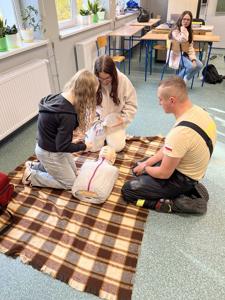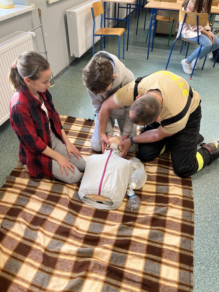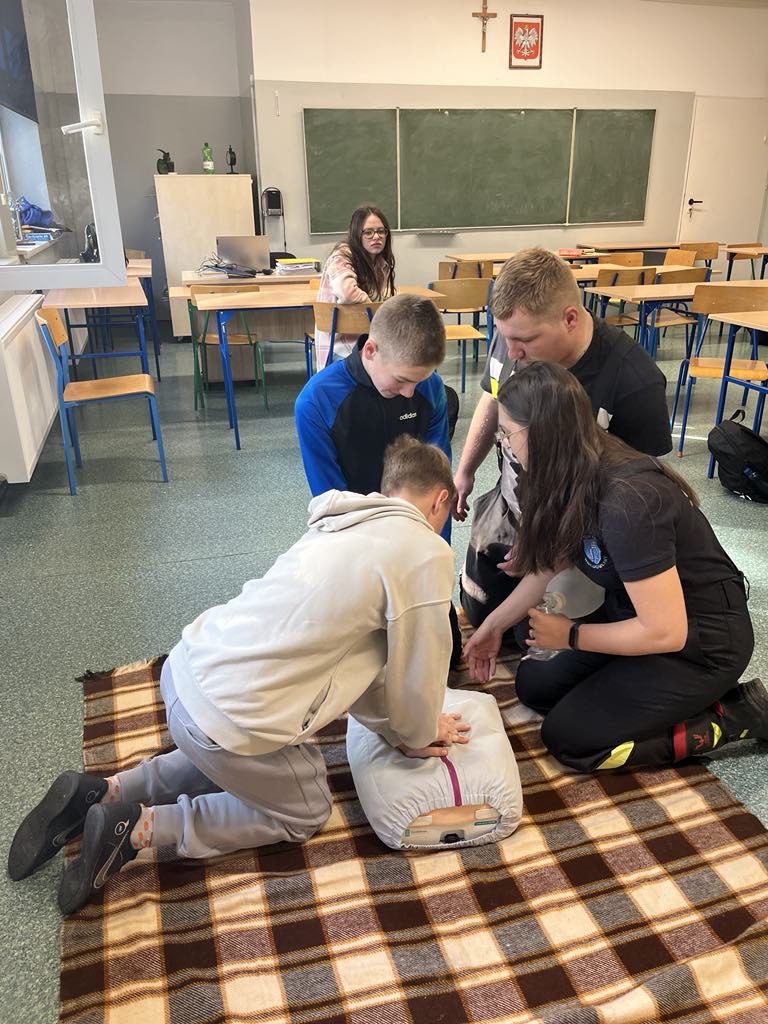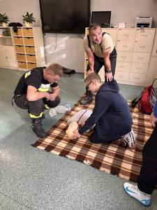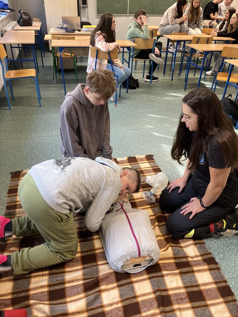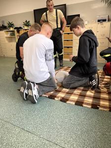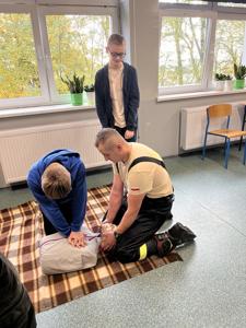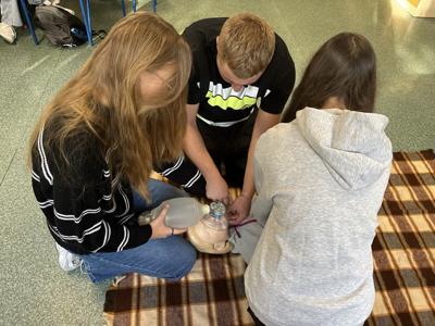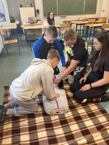 W dniu 28 października 2024 r. w ramach obowiązkowych zajęć z zakresu edukacji prozdrowotnej na godzinie wychowawczej w klasach VII i VIII odbyły się zajęcia z zakresu udzielania pierwszej pomocy. Każdy uczeń w praktyce mógł ćwiczyć takie umiejętności jak: powiadamianie służb ratunkowych, rozpoznawanie rodzaju zagrożenia, układanie poszkodowanego w pozycji bocznej ustalonej, resuscytację.