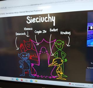 W ramach kampanii uczniowie klas I-III wzięli udział w konferencji online „Sieciakowa lekcja: Internet mocy bez przemocy”. Spotkanie to skierowane było do dzieci w wieku 7-10 lat. Lekcja ta odbywała się w czasie rzeczywistym i trwała 45 minut. Głównym celem było zapoznanie uczniów z zasadami bezpiecznego korzystania z internetu oraz wspólnie próbowano uzyskać odpowiedź na pytanie „Co to jest hejt?”. Dzięki udziałowi w tym spotkaniu nasi uczniowie mieli możliwość wymiany pomysłów i spostrzeżeń z rówieśnikami z całej Polski. Uczniowie mogli również wykazać się znajomością obsługi komputera. Podczas zajęć należało udzielać odpowiedzi wykorzystując mikrofony, zaznaczając właściwe odpowiedzi oraz wpisać naszą szkołę na mapę uczestników wydarzenia. Istotnym elementem spotkania były ćwiczenia ruchowe oraz wskazanie dzieciom zasady bezpiecznego i racjonalnego korzystania z komputera. Prowadzący spotkanie zwrócił uwagę, na potrzebę przerwy podczas pracy z monitorem. Wskazał negatywne skutki ciągłego korzystania z komputera. Dla dzieci to spotkanie było ogromną skarbnicą wiedzy zarówno teoretycznej jak i praktycznej. Z ogromną przyjemnością będziemy uczestniczyć w kolejnej „Sieciakowej lekcji”.