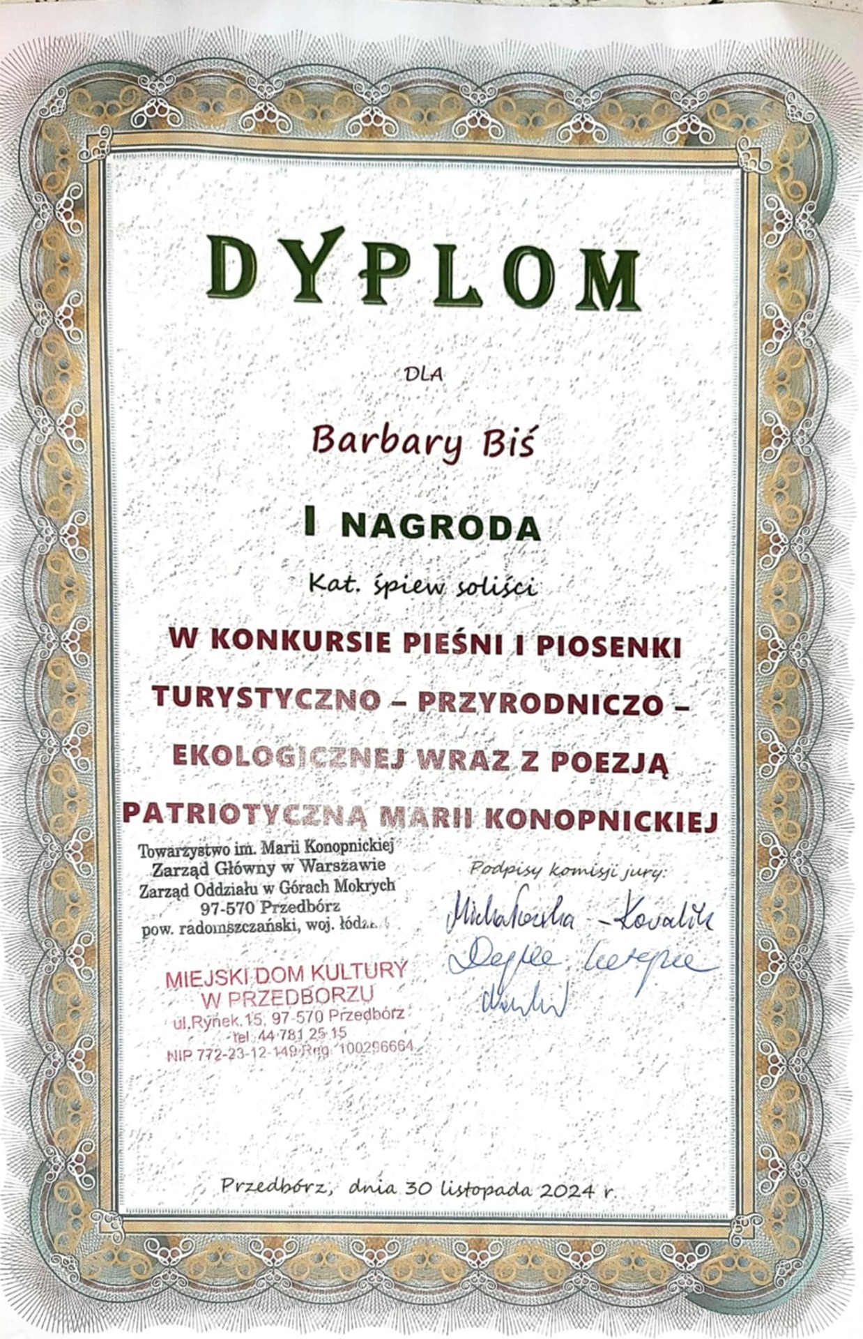 Bardzo miło jest nam poinformować, że uczennica klasy szóstej naszej szkoły Barbara Biś zdobyła Pierwszą Nagrodę w Konkursie Pieśni i Piosenki Turystyczno-Przyrodniczo-Ekologicznej wraz z Poezją Patriotyczną Marii Konopnickiej.