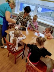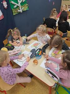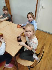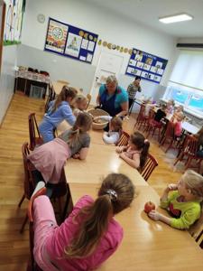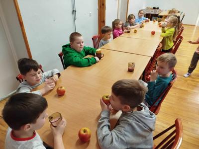 Podczas spotkania dzieci poznały piramidę zdrowego żywienia, dowiedziały się, że posiłki w szkole są urozmaicone – bogate w warzywa, owoce, produkty mleczne i witaminy, które mają bardzo duże znaczenie dla zdrowia i prawidłowego rozwoju dzieci. Rozmawiały także na temat produktów, które szkodzą naszemu zdrowiu. Temat zdrowego stylu życia nie był dzieciom obcy, wykazały się wiedzą podczas odpowiedzi na pytania, które zadawała pani Bogumiła Bąk. W trakcie wizyty panie przygotowały pyszny i zdrowy koktajl owocowy, który dzieci ze smakiem wypiły. Przedszkolaki wykonały pracę plastyczną „Sok jabłkowy”. Bardzo dziękujemy za miłe i bogate w wiedzę spotkanie oraz wspaniałą atmosferę.