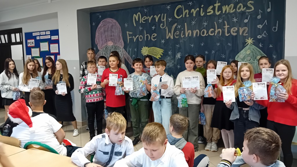 Dnia 19 grudnia 2024 roku, w naszej szkole odbył się wyjątkowy Konkurs Piosenki Świątecznej w języku angielskim i niemieckim. W konkursie wzięło udział 27 uczestników z klas IV-VIII, którzy zaprezentowali swoje umiejętności wokalne. Uczniowie wykonali zarówno tradycyjne kolędy, jak i współczesne świąteczne piosenki w języku angielskim i niemieckim.