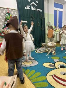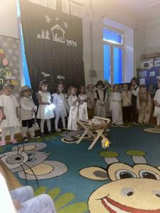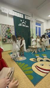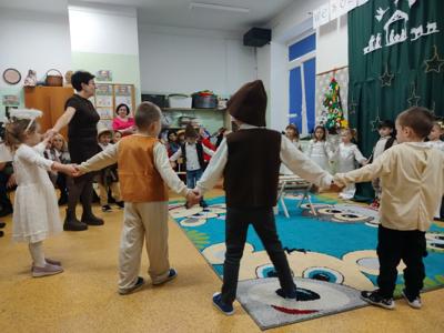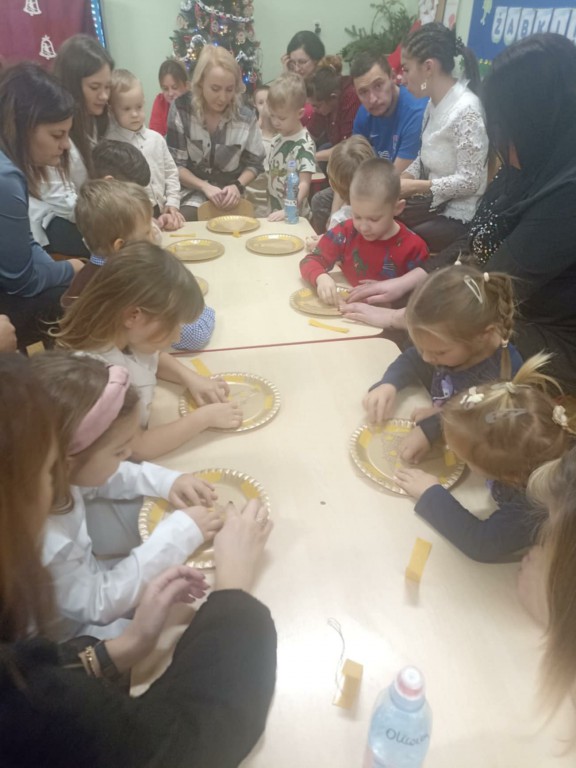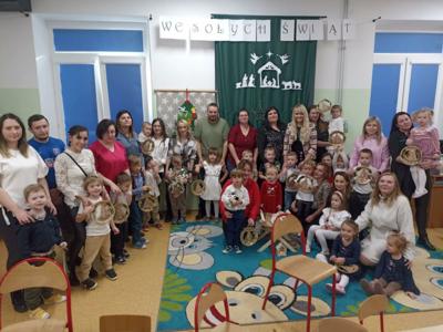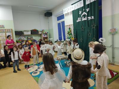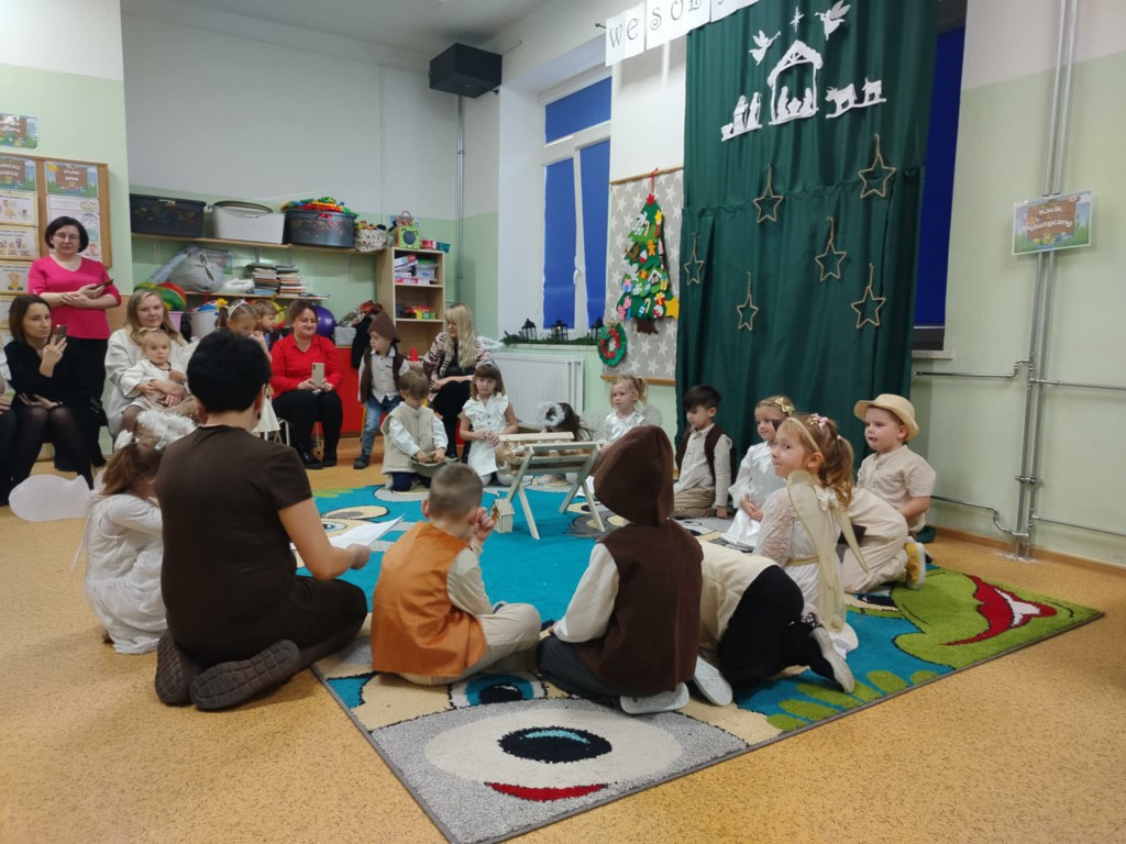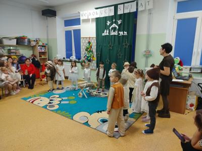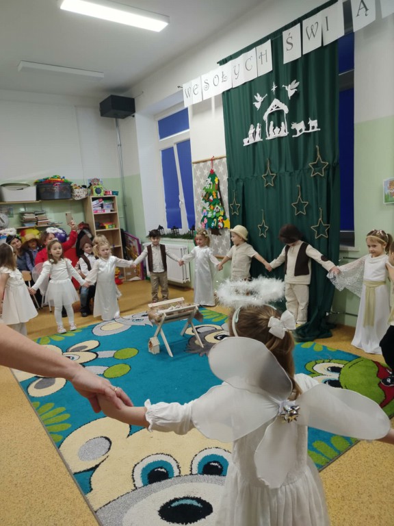 Radość z nadchodzących Świąt Bożego Narodzenia zagościła w grupie 4-latków. Oczekiwanie na przyjście Dzieciątka Jezus zostało poprzedzone licznymi przygotowaniami. Była to nie tylko świąteczna dekoracja sali, ale również nauka wierszy, piosenek, układ pracy mogli zobaczyć rodzice, którzy zostali zaproszeni na spotkanie. Przy żłóbku Jezuska zgromadzili się mali pasterze oraz aniołki. Śpiewem i tańcem oddawali mu cześć oraz radowali się z jego obecności. Dzieci złożyły swoim rodzicom życzenia świąteczne , dając wyraz swojej ogromnej miłości dla nich. Została zachowana tradycja dzielenia się opłatkiem oraz wspólnego kolędowania przy choince.