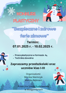 Konkurs Bezpieczne i zdrowe ferie zimowe Zdjęcia Zobacz również 17 grudnia 2024 – Bożonarodzeniowy konkurs plastyczny... 18 grudnia 2024 r. - Dzień piżamy w naszej szkole Warsztaty Bożonarodzeniowe z częścią artystyczną... Konkurs Bezpieczne i zdrowe ferie zimowe Rekrutacja na rok szkolny 2025 - 2026 20 stycznia 2025 - Wycieczka przedszkolaków do... 07 stycznia 2025 Aktualności Wydrukuj Udostępnij Wyświetlono: 104