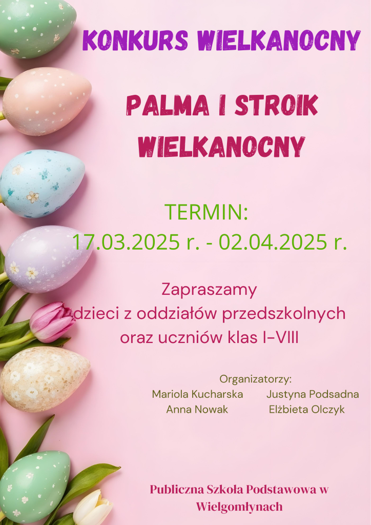 Konkurs Wielkanocny Zdjęcia Zobacz również 13 luty - Dzień babci i dziadka w klasie Ia Wyniki pierwszego etapu rekrutacji do oddziałów... 11 marca - „Zbieraj baterie i telefony”- miesiąc... Konkurs Wielkanocny Udział w konkursie „Poznajemy Parki Krajobrazowe... 20 marca 2025 - Wycieczka do Niedośpielina 17 marca 2025 Aktualności Wydrukuj Udostępnij Wyświetlono: 89