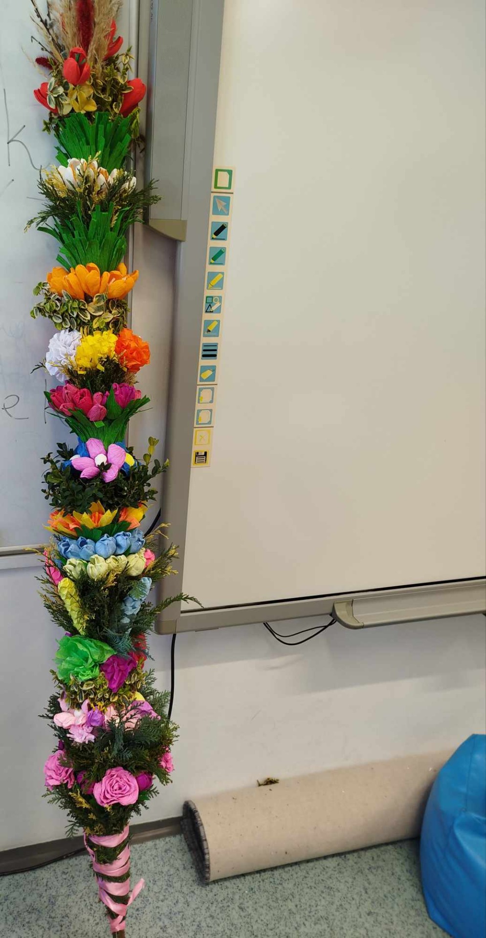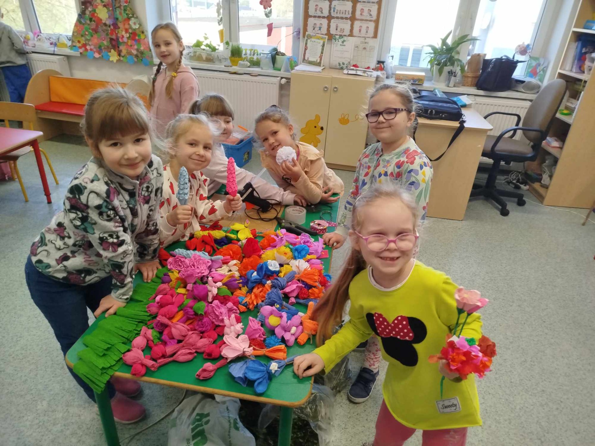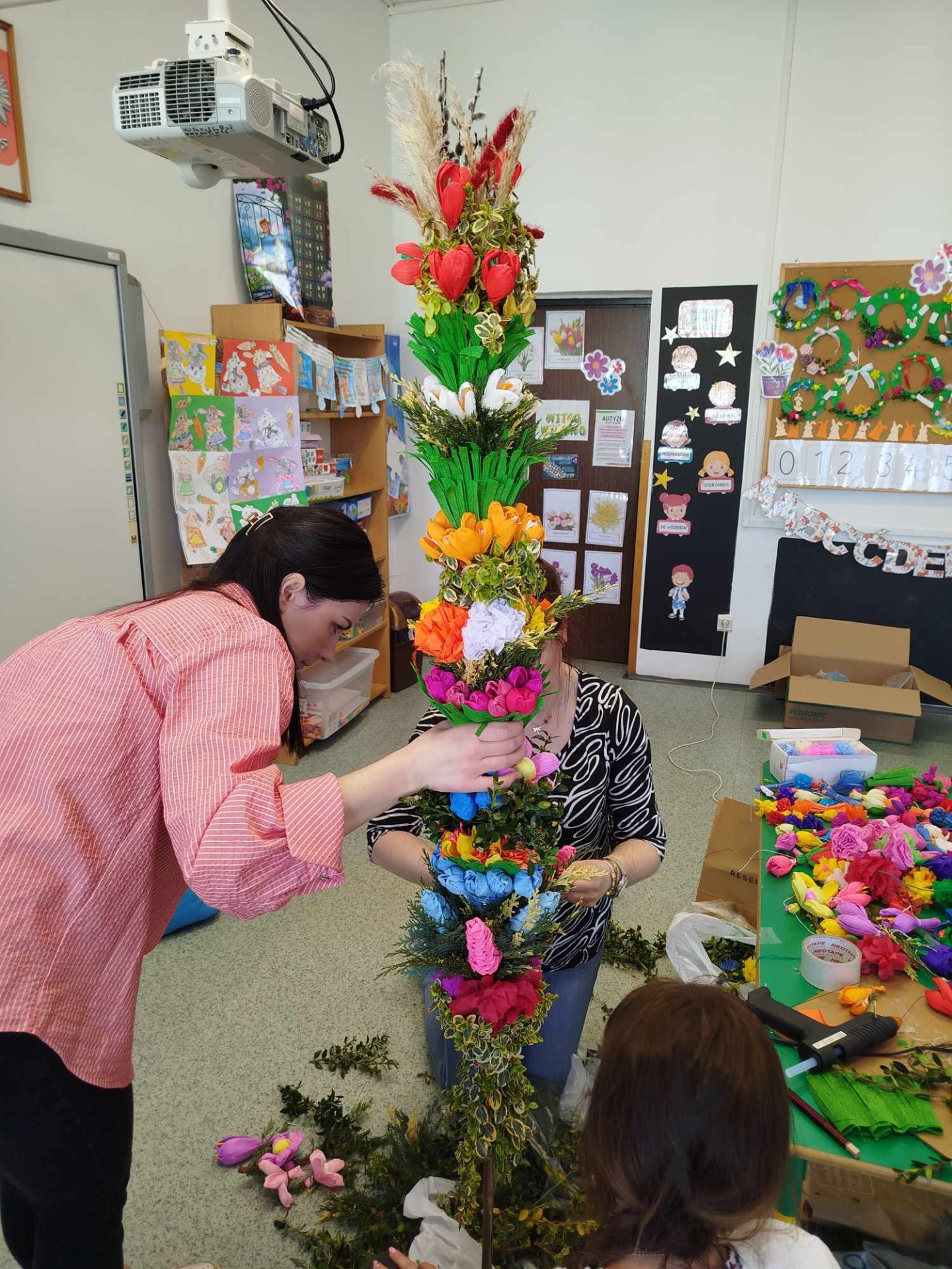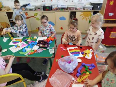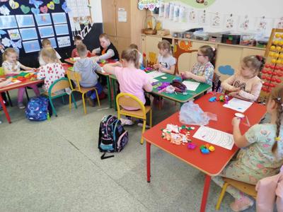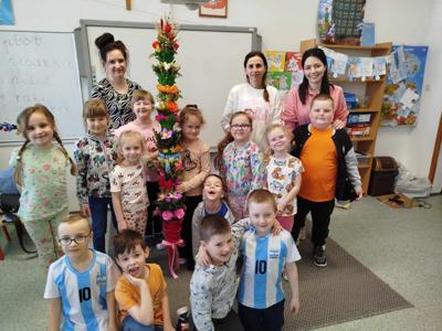 W czwartek 4 kwietnia odbyły się warsztaty wielkanocne w 2 grupie „0”b, podczas których rodzice i dzieci tworzyły palmę wielkanocną oraz ozdoby na wielkanocny stół. W repertuarze rękodzieła były palmy, wianuszki oraz pisanki zdobione różnymi technikami. We wspaniałym gronie, miłej atmosferze, wśród utalentowanych mam, pomysłów było bardzo wiele. Nasza sala zamieniła się na moment w pracownię plastyczną, w której działo się wiele wspaniałych rzeczy. Wszyscy pracowali z ogromnym zapałem. Powstała miedzy innymi piękna i ogromna palma wielkanocna z ręcznie wykonanych kwiatów z krepiny oraz bukszpanu. Dziękujemy wszystkim obecnym na warsztatach mamom, które miały okazje spędzić czas kreatywnie z własnymi pociechami. Zajęcia integracyjne rodzic-dziecko przyniosły wiele radości oraz satysfakcji z wykonanych samodzielnie prac.