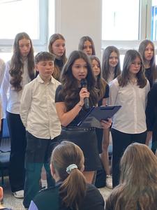 Spotkanie rozpoczęło się odśpiewaniem hymnu państwowego przez społeczność szkolną. Następnie uczniowie klas 6 i 7, w specjalnie przygotowanym montażu słowno-muzycznym, przedstawili najważniejsze fakty dotyczące zbrodni katyńskiej. Ponadto recytowali wiersze i śpiewali pieśni odnoszące się do wydarzeń z wiosny 1940 roku. Zebrana publiczność nagrodziła występujących gromkimi brawami.