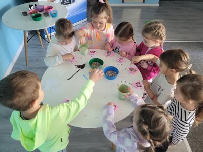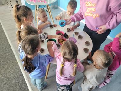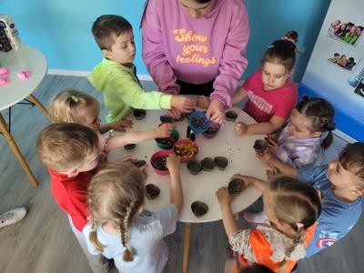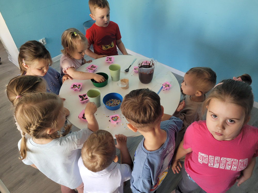 Nie zabrakło również zajęć kreatywnych – dzieci uczestniczyły w warsztatach robienia mydełek, gdzie własnoręcznie tworzyły pachnące, kolorowe mydełka w różnych kształtach. Na zakończenie czekała prawdziwa uczta dla zmysłów – warsztaty robienia czekolady. Przedszkolaki dowiedziały się, jak powstaje czekolada, miały okazję przygotować swoje własne, pyszne czekoladki z ulubionymi dodatkami.