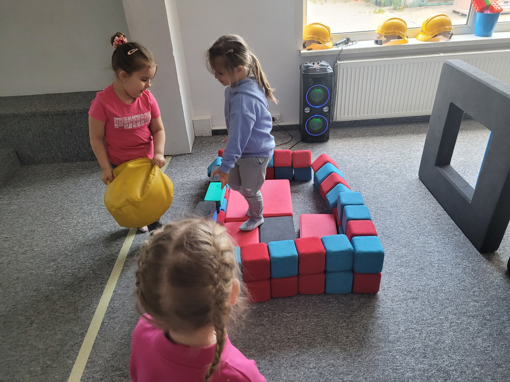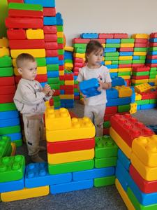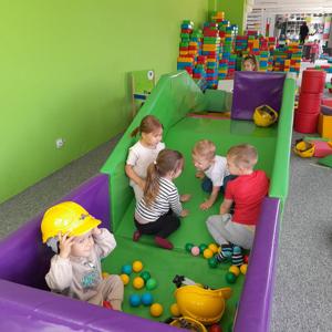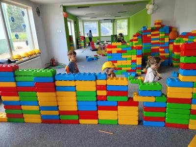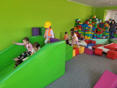 Pierwszym punktem programu były zabawy z animatorem w kolorowej sali zabaw, gdzie dzieci mogły do woli biegać, zjeżdżać i skakać. Miały także okazję do rozwijania wyobraźni podczas zabawy różnego rodzaju klockami - powstały niesamowite konstrukcje, od zamków po pojazdy. Wspólna praca nad budowlami sprzyjała także integracji i nauce współpracy.