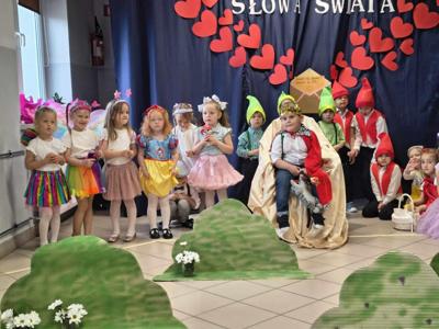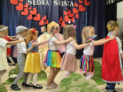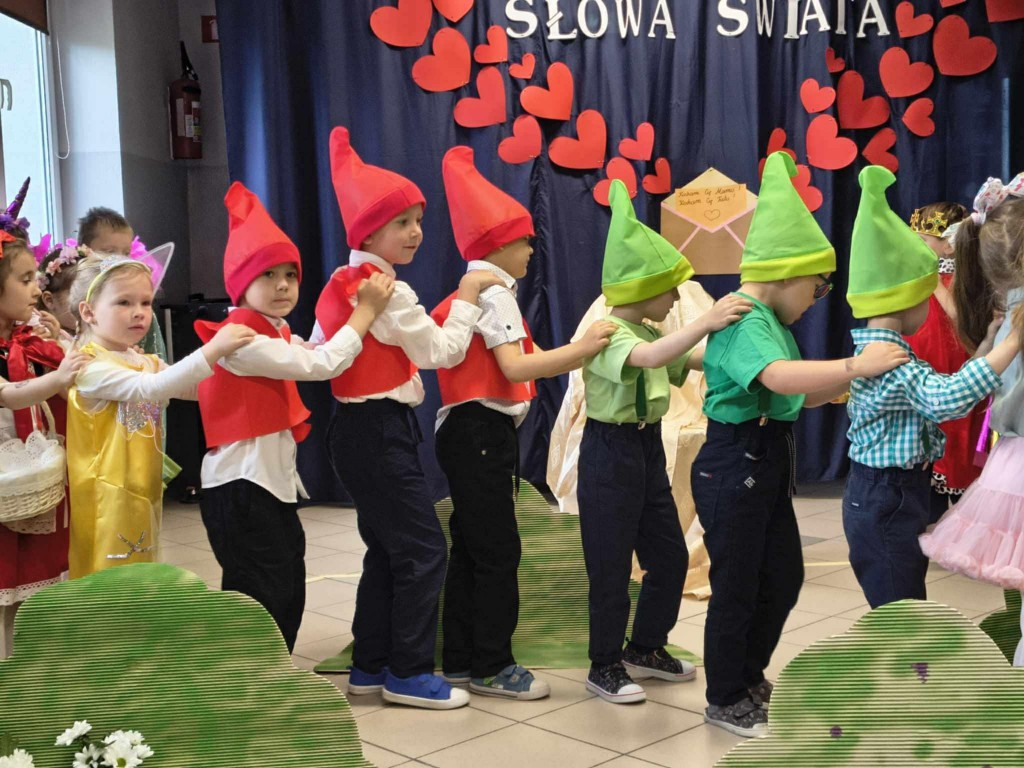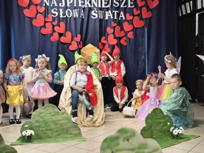 Dzieci poprzebierane za postacie z bajek zaprezentowały program artystyczny pełen piosenek, wierszyków i krótkich scenek teatralnych. Na scenie pojawili się m.in. Czerwony Kapturek, Wilk, Czarownica, Śnieżka z krasnoludkami, Rybak i Złota Rybka, Jaś i Małgosia, wróżki, elfy a także król - a wszystko to w pięknej oprawie muzycznej i kolorowej scenografii.