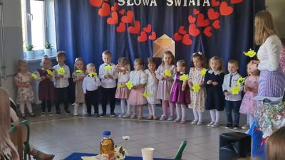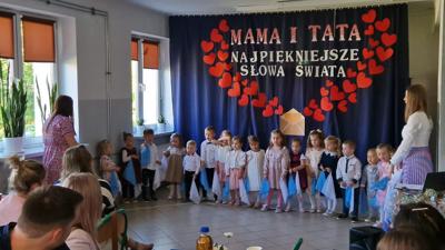 Przedszkolaki wierszem, tańcem i piosenką przekazały swoim rodzicom najpiękniejsze życzenia z okazji ich święta. Było pięknie, energicznie, ale też wzruszająco. Występ wzbudził niesamowite emocje. Po zakończeniu części artystycznej, dzieci wręczyły rodzicom własnoręcznie przygotowane upominki. Następnie wszyscy zostali zaproszeni na słodki poczęstunek.