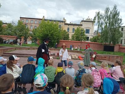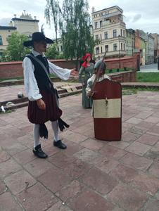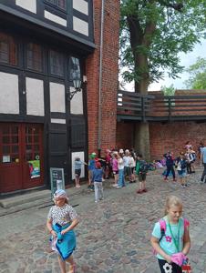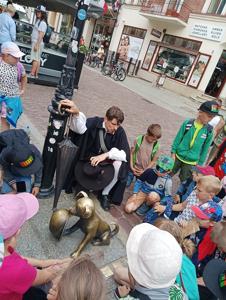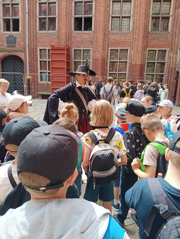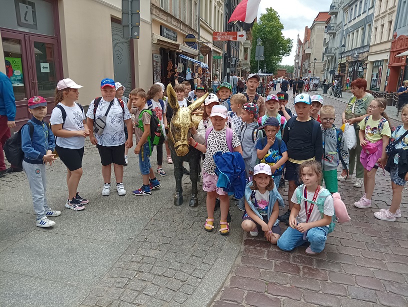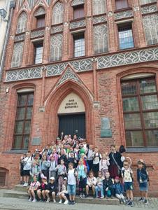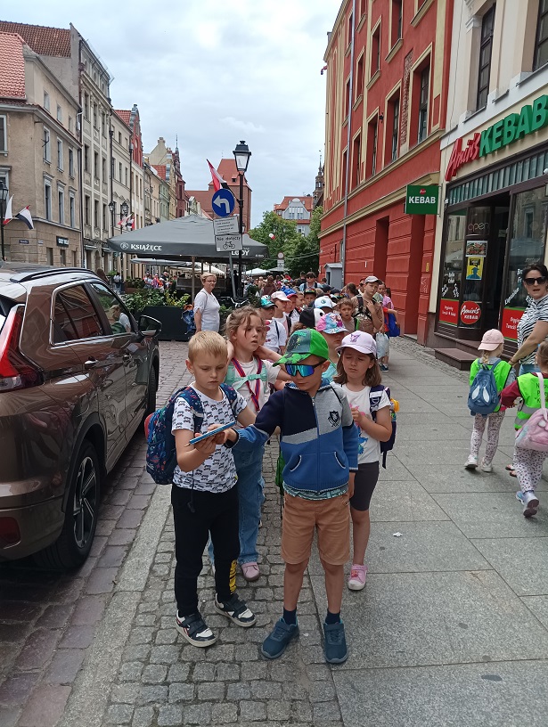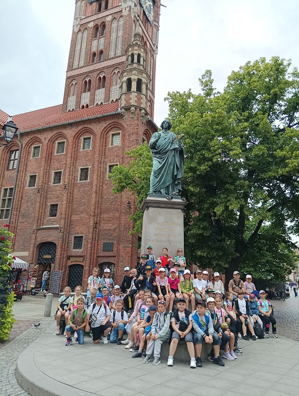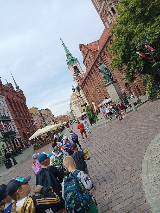 Następnie wraz z naszym przewodnikiem Mistrzem Arturem wybraliśmy się na spacer po Starym Mieście. Wąskimi uliczkami przeszliśmy pod Krzywą Wieżę z którą związana jest legenda o zakochanym zakonniku. Odwiedziliśmy również Bazylikę katedralną św. Jana Chrzciciela i św. Jana Ewangelisty w Toruniu gdzie znajduje się jeden z największych dzwonów Tuba Dei. Zobaczyliśmy pomnik Mikołaja Kopernika, ratusz, kamienice mieszczańskie z końca XIII-XVIII w., Dom Kopernika - przypuszczalne miejsce urodzin słynnego astronoma i Bulwar Filadelfijski ciągnący się wzdłuż Wisły na całej długości średniowiecznych murów miejskich. Poznaliśmy również historię osiołka toruńskiego oraz historię psa Filusia podczas oglądania pomników tych zwierząt.