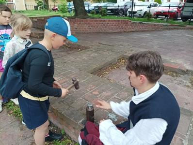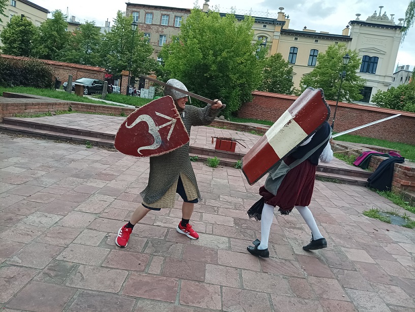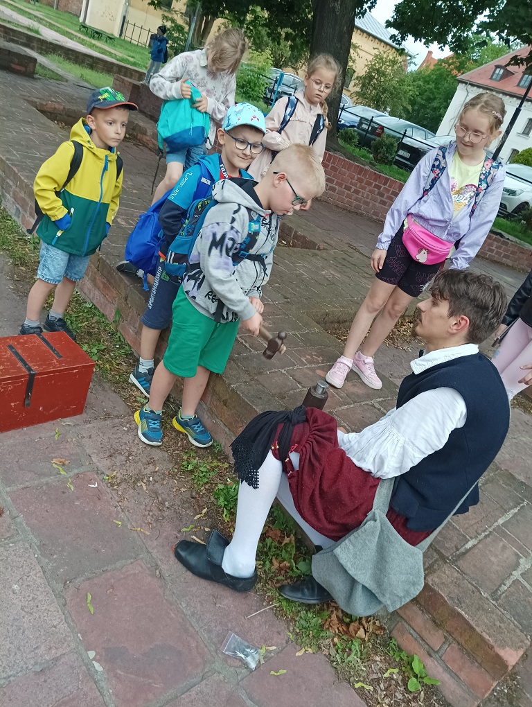 Bardzo interesującym punktem wycieczki był pokaz rycerski, podczas którego uczniowie dowiedzieli się z czego składał się strój rycerza, kto nim mógł zostać. Dzieci poznały również elementy strojów ludzi z tamtych czasów, mając możliwość ich przymierzenia. Następnie zobaczyliśmy walkę rycerską. Uczniowie wspólnie z Mistrzem Arturem samodzielnie wyrabiali swoją monetę.