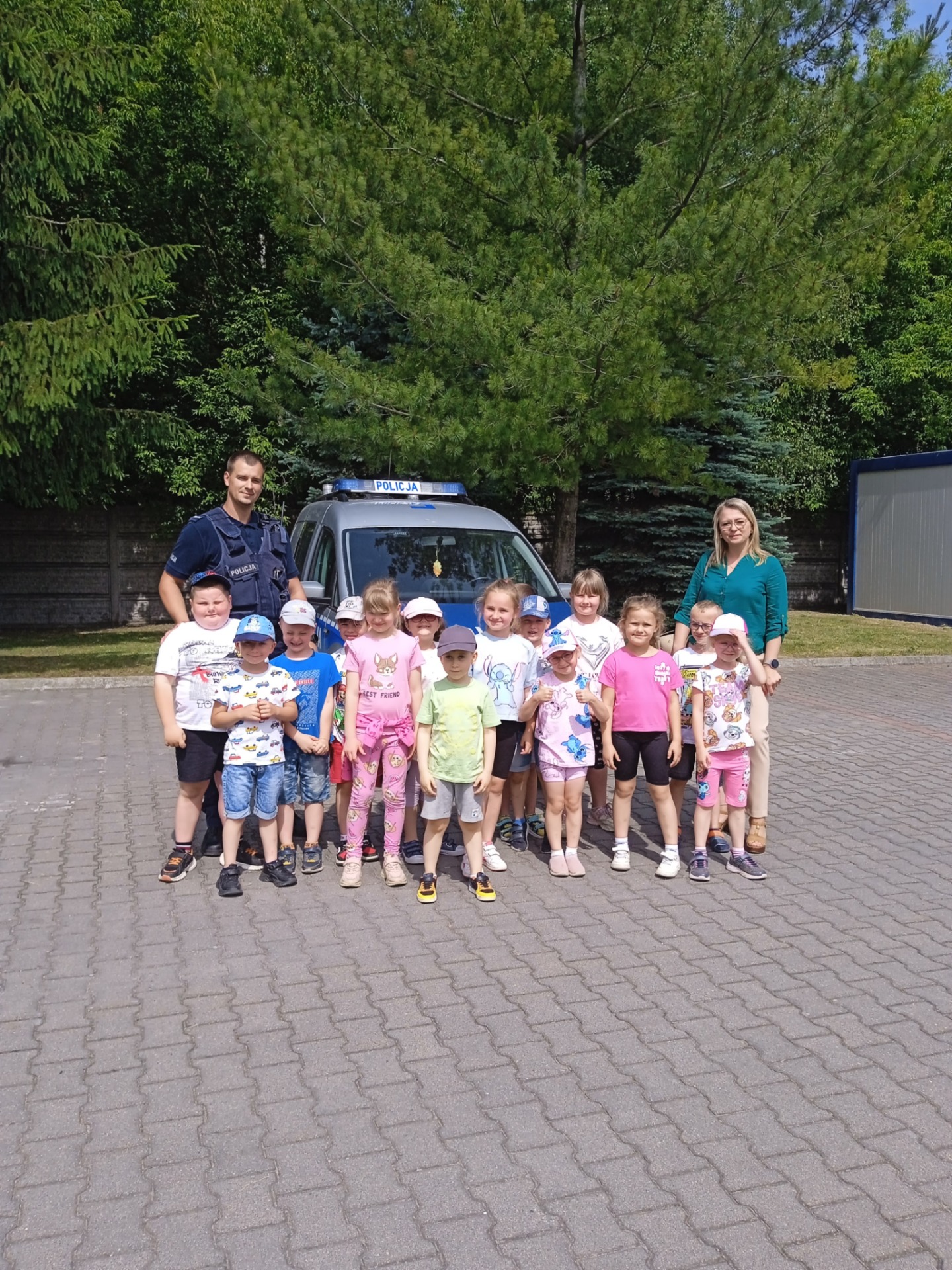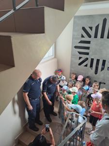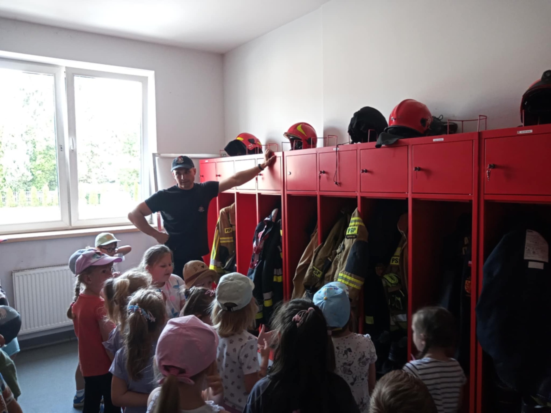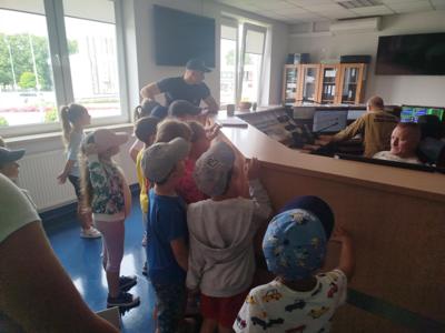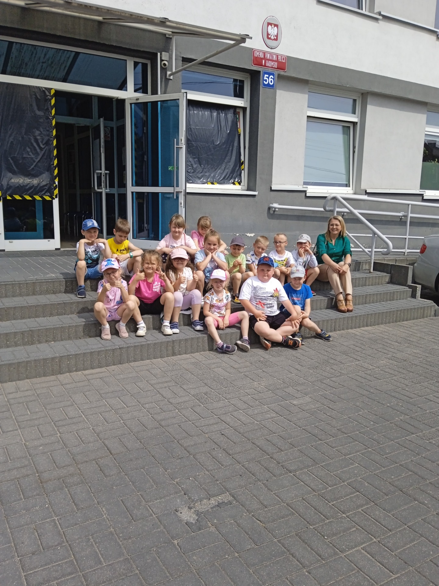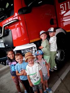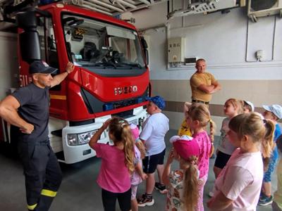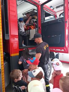 Dzieci uczestniczyły w krótkiej lekcji bezpieczeństwa, podczas której przypominano zasady bezpiecznego poruszania się po drodze, kontaktów z osobami obcymi, a przede wszystkim otrzymały cenne rady jak należy spędzić bezpieczne wakacje. Następnym punktem wycieczki była wizyta w Komendzie Powiatowej Państwowej Straży Pożarnej, tam dzieci obejrzały wóz strażacki oraz sprzęt wykorzystywany podczas akcji ratunkowych.