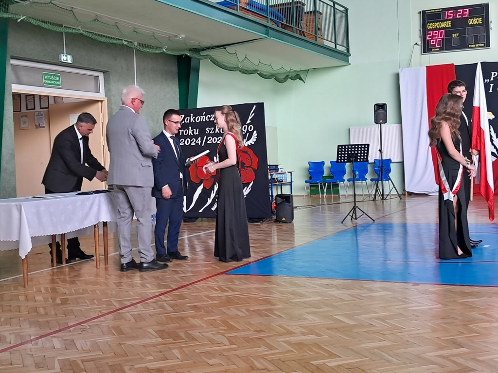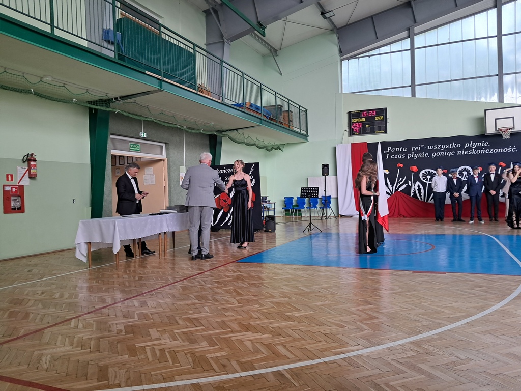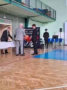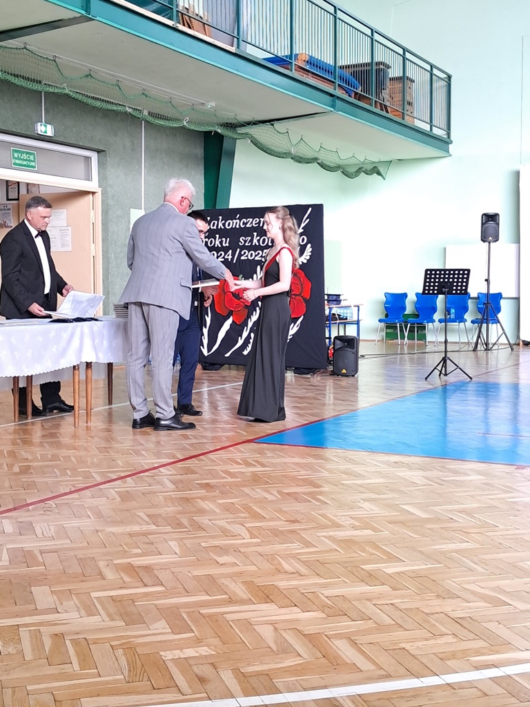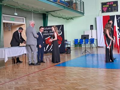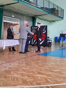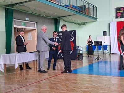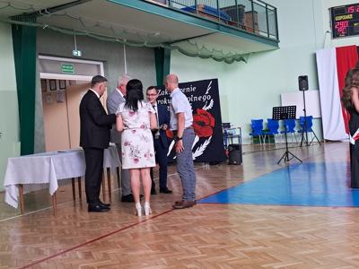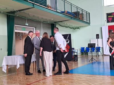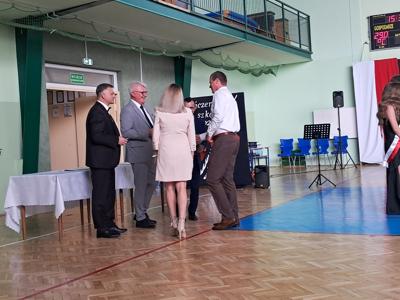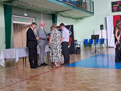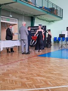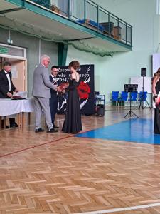 Następnie ósmoklasiści zaprezentowali przygotowaną przez siebie część artystyczną, pełną wspomnień, uśmiechu, ale też wzruszenia. Na zakończenie Dyrektor Szkoły Leszek Wróblewski wraz z Wójtem Gminy Panem Marcinem Tomczykiem oraz wychowawcą klasy Panem Robertem Aleksandrowiczem wręczyli nagrody książkowe, dyplomy i drobne upominki, a pięcioro absolwentów usłyszało słowa uznania za osiągnięcia naukowe i społeczne. Wyróżniono także rodziców uczniów, którzy w szczególny i bezinteresowny sposób wspierali szkołę. Życzenia i wiele ciepłych opuszczającym uczniom wypowiedział w tym miejscu Pan Wójt.
