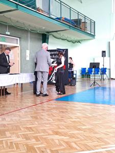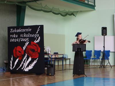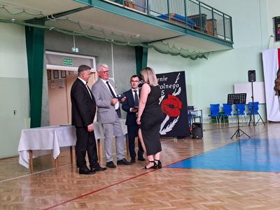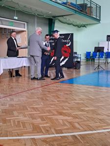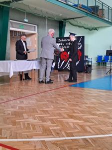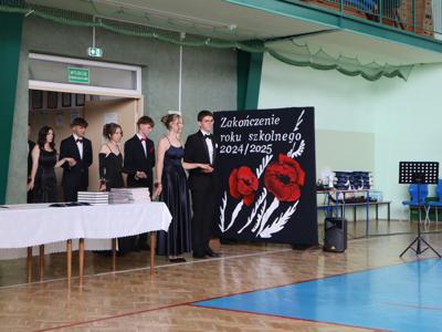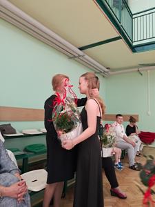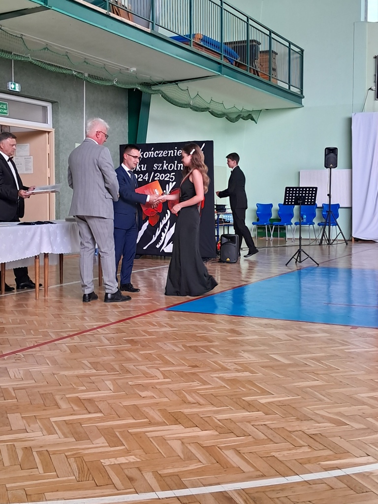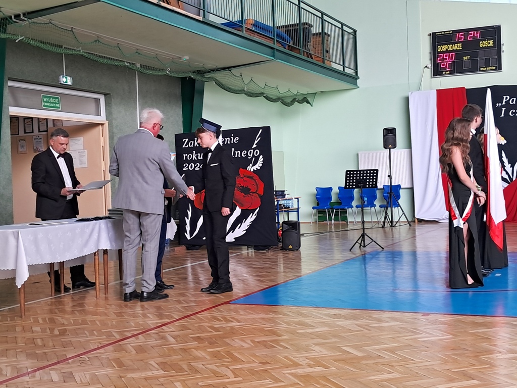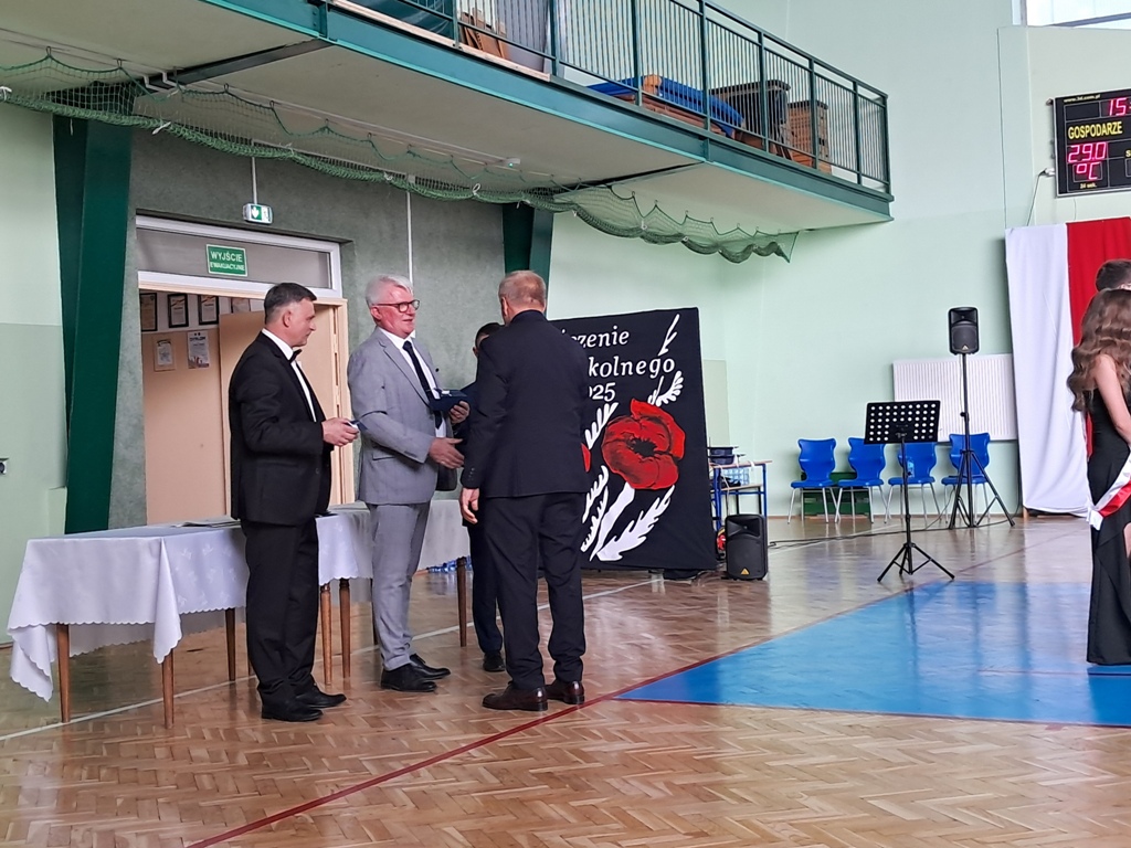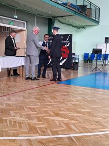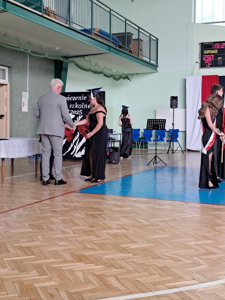 Następnie ósmoklasiści zaprezentowali przygotowaną przez siebie część artystyczną, pełną wspomnień, uśmiechu, ale też wzruszenia. Na zakończenie Dyrektor Szkoły Leszek Wróblewski wraz z Wójtem Gminy Panem Marcinem Tomczykiem oraz wychowawcą klasy Panem Robertem Aleksandrowiczem wręczyli nagrody książkowe, dyplomy i drobne upominki, a pięcioro absolwentów usłyszało słowa uznania za osiągnięcia naukowe i społeczne. Wyróżniono także rodziców uczniów, którzy w szczególny i bezinteresowny sposób wspierali szkołę. Życzenia i wiele ciepłych opuszczającym uczniom wypowiedział w tym miejscu Pan Wójt.