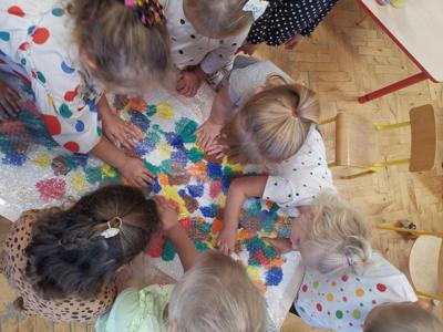15 września dzieci z oddziałów przedszkolnych świętowały Dzień Kropki. Inspiracją do obchodów tego dnia jest książka Petera H. Reynoldsa "Kropka". Bohaterką opowieści jest mała Vashti, która dzięki jednej kropce i wsparciu nauczycielki odkryła swój talent i uwierzyła w siebie. Ten dzień był w naszym przedszkolu pełen koloru i kreatywności. Miał na celu pobudzenie pomysłowości i wiary we własne możliwości dzieci poprzez zabawy z kropką w roli głównej. Przedszkolaki tworzyły kropkowe dzieła sztuki, szukały kropek w otoczeniu i uczestniczyły w kropkowych zabawach ruchowych.
