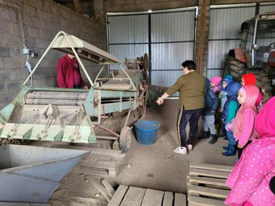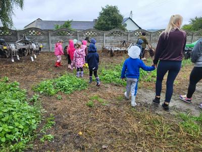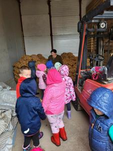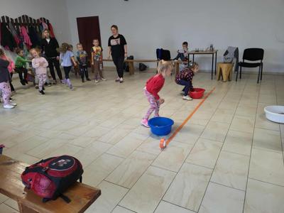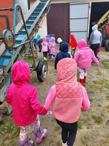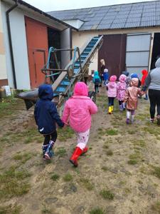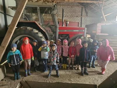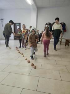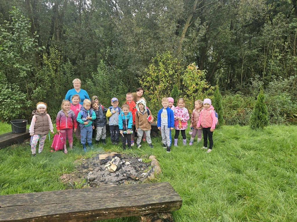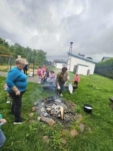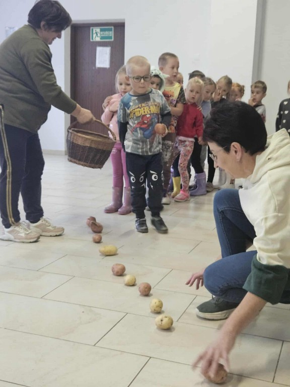 Grupa 5-latków wybrała się na wycieczkę do Trzebiec, aby wspólnie z przedstawicielkami Koła Gospodyń Wiejskich obchodzić Dzień Pieczonego Ziemniaka. Pomimo, iż aura pogodowa nie była tego dnia sprzyjająca, to nie stanowiło to przeszkody, by spędzić wyjątkowy dzień.. Na dzieci czekało mnóstwo atrakcji. Korzystając z gościnności miejscowego gospodarza zajmującego się uprawą ziemniaków dzieci mogły zobaczyć sprzęty rolnicze służące do ich uprawy i zbioru. Dowiedziały sie wielu informacji dotyczących sposobu przygotowania ziemi pod uprawę, sadzenia oraz wykopek. Czynności dzieci te ilustrowały ruchem podczas zabaw w świetlicy wiejskiej. Nie zabrakło konkurencji sportowych z ziemniakiem w roli głównej. Powstały również prace plastyczne z ziemniaczanych stempelków. Panie z Koła Gospodyń Wiejskich przygotowały dzieciom pyszne frytki, a uwieńczeniem dnia było pieczenie ziemniaka w ognisku.