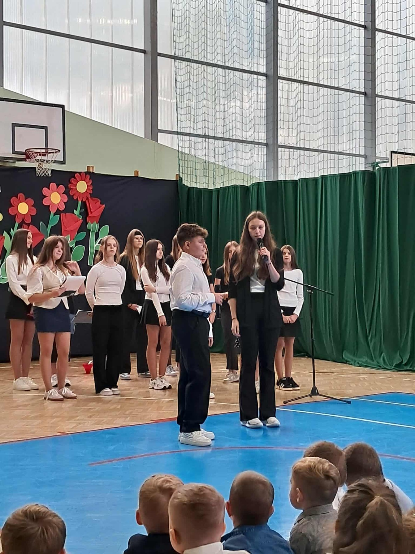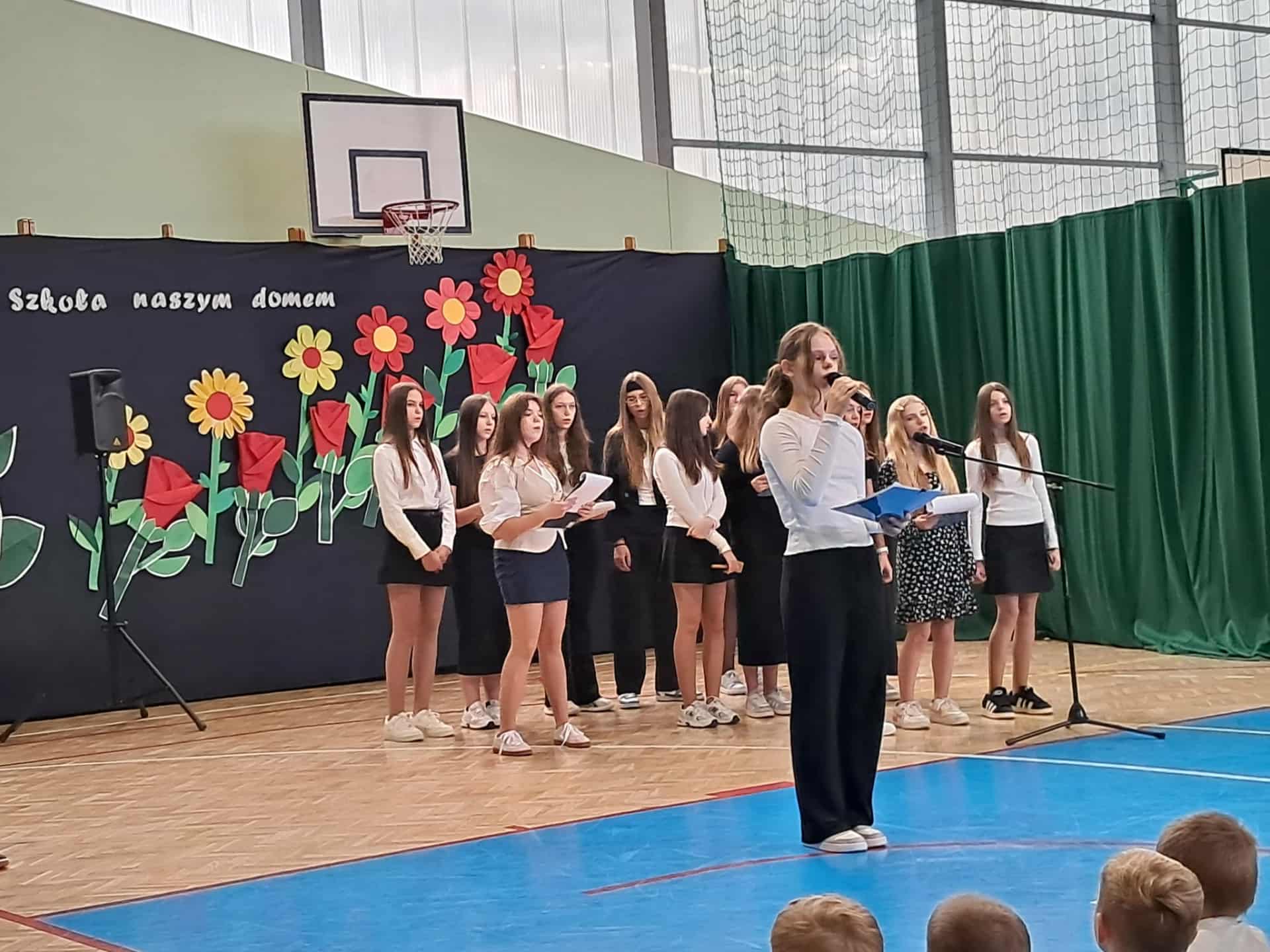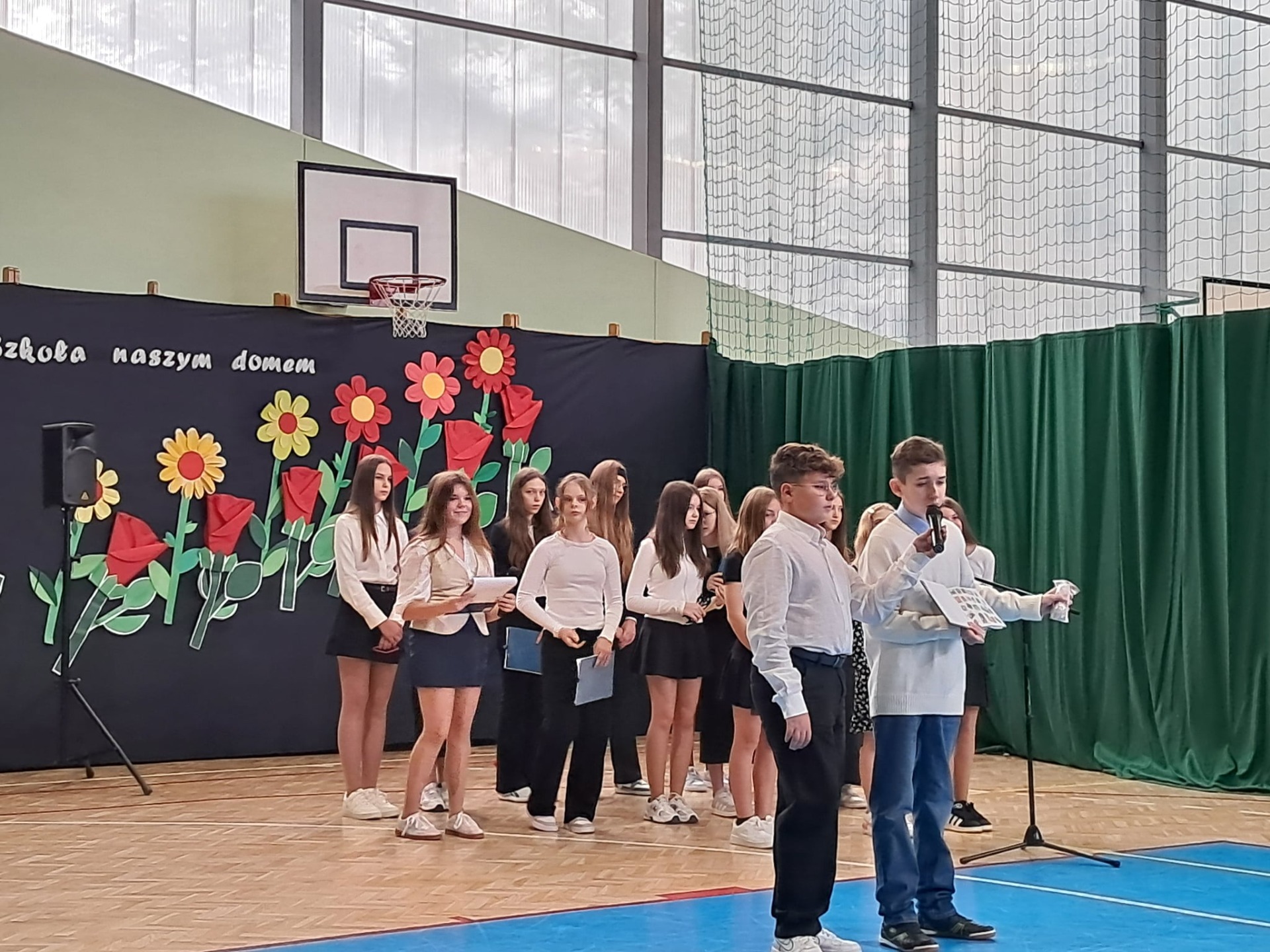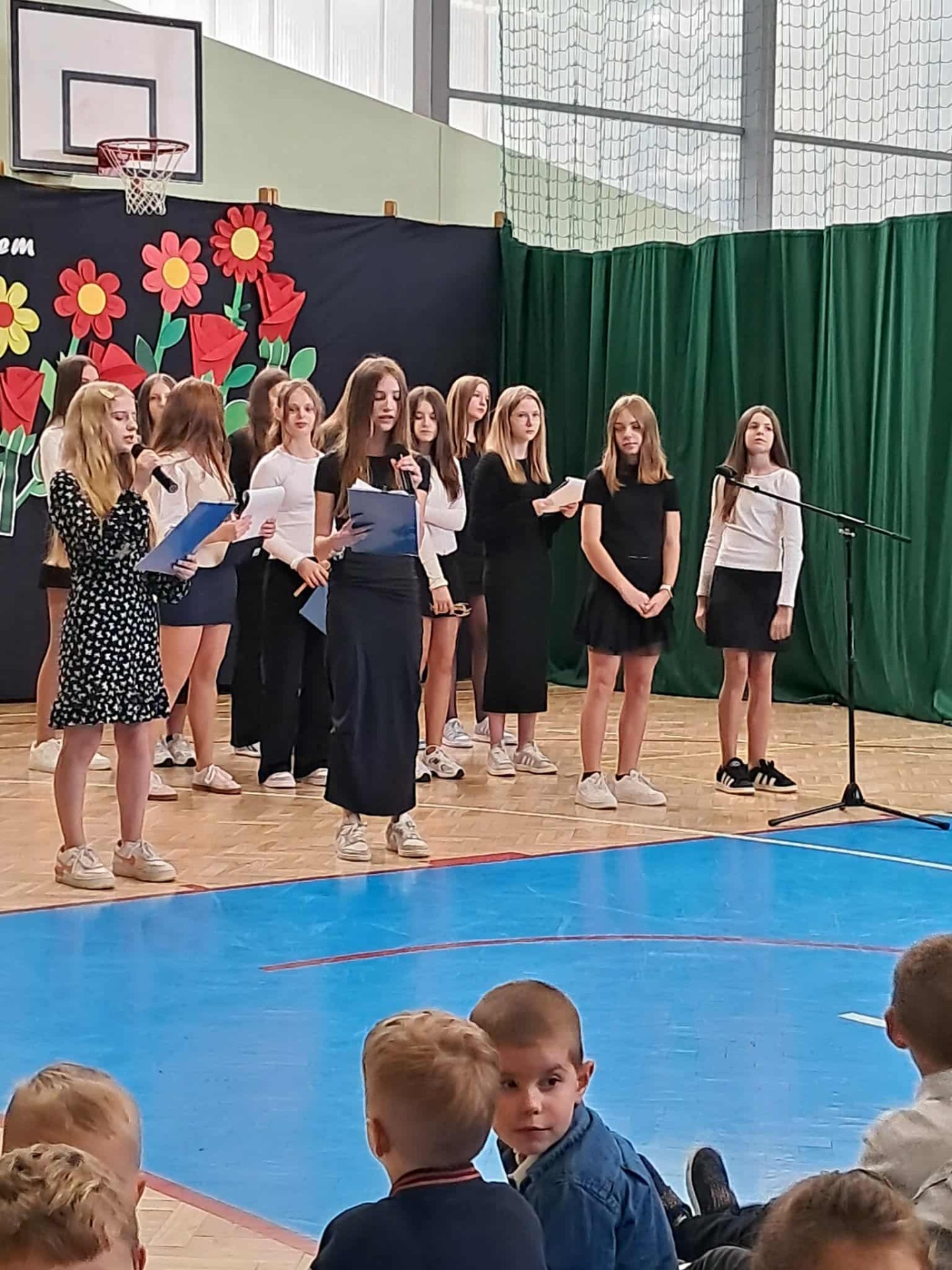 W tym dniu pamiętamy o wszystkich nauczycielach i pracownikach szkoły.I właśnie z tej okazji cała społeczność szkolna spotkała się na uroczystej akademii. Przygotowali ją uczniowie klas: 7 oraz 8 pod kierunkiem Pani Elżbiety Olczyk oraz Pani Katarzyny Bień. Dzieci pięknymi wierszami, piosenkami i scenkami wyraziły swoje podziękowanie za serce, uśmiech… i przeprosiły za psoty, figle…. W zabawny sposób zaprezentowały obraz współczesnej szkoły.