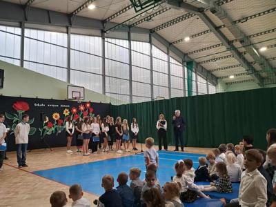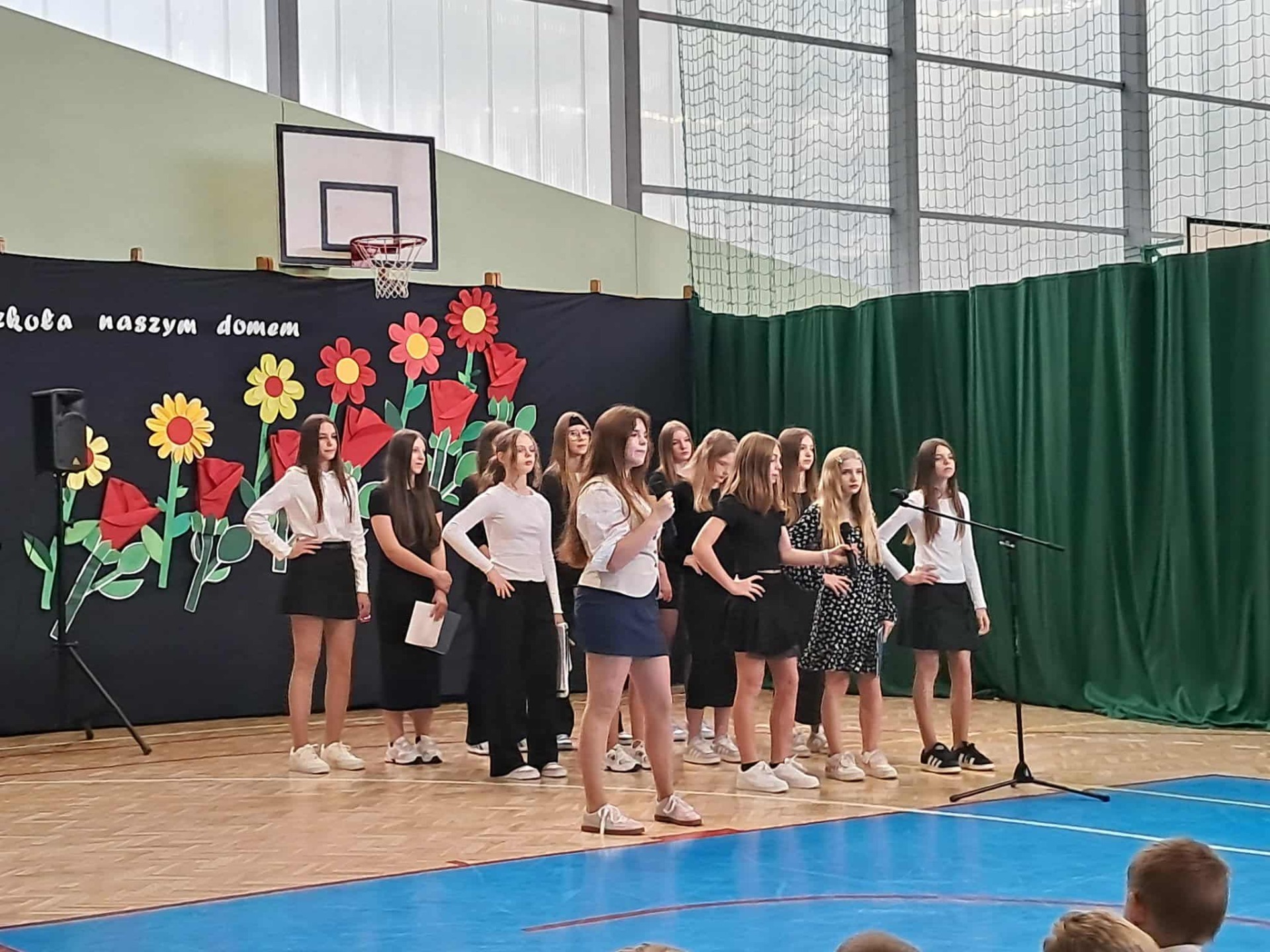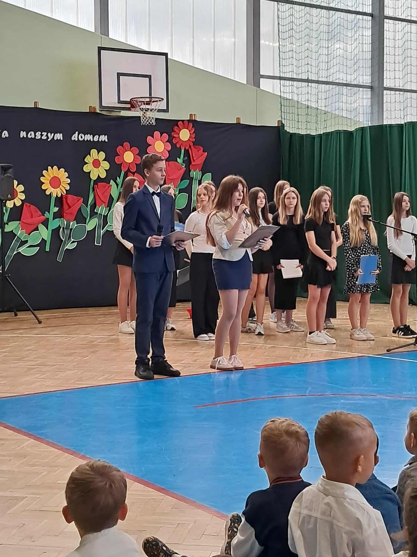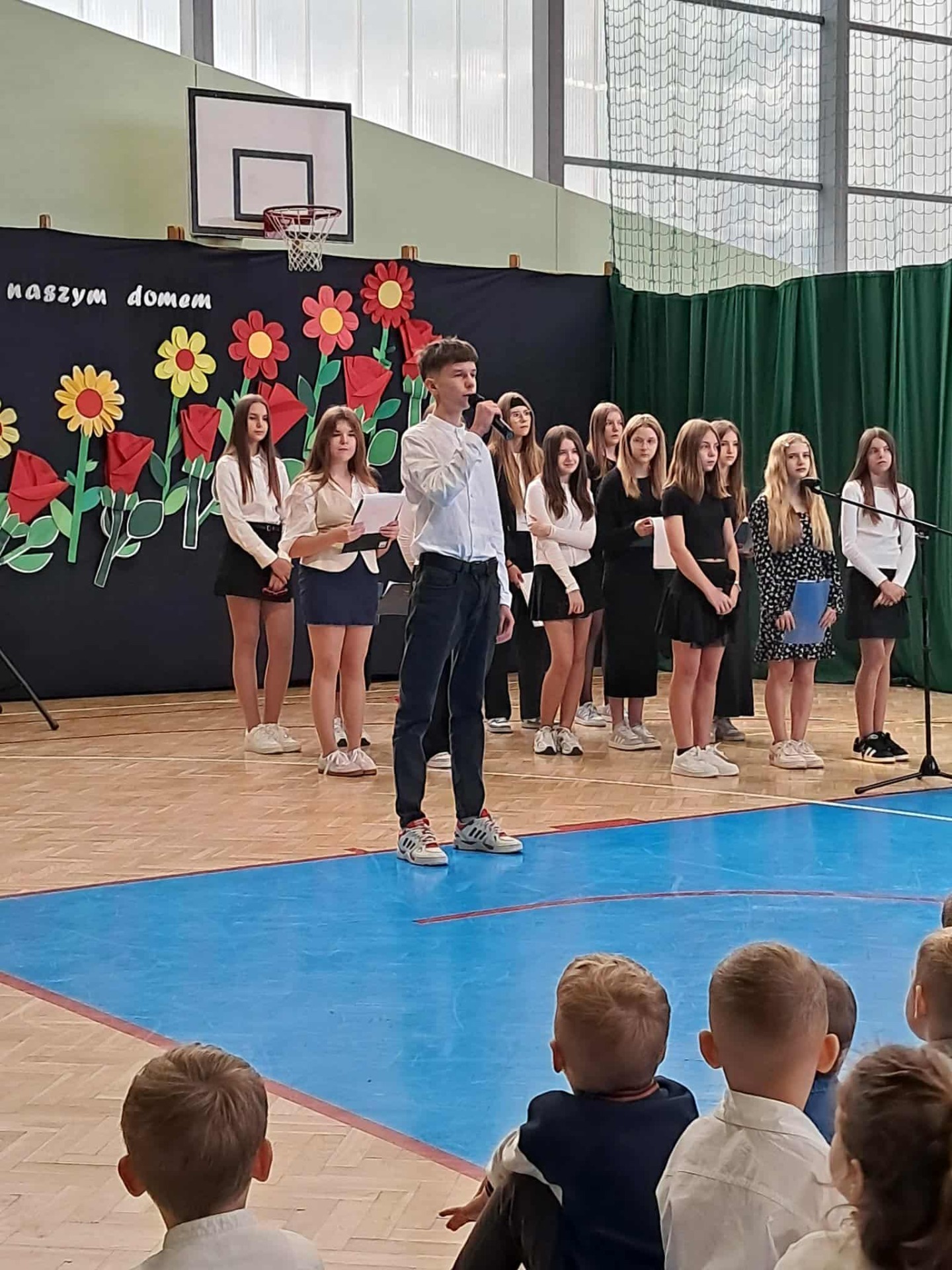 W tym dniu pamiętamy o wszystkich nauczycielach i pracownikach szkoły.I właśnie z tej okazji cała społeczność szkolna spotkała się na uroczystej akademii. Przygotowali ją uczniowie klas: 7 oraz 8 pod kierunkiem Pani Elżbiety Olczyk oraz Pani Katarzyny Bień. Dzieci pięknymi wierszami, piosenkami i scenkami wyraziły swoje podziękowanie za serce, uśmiech… i przeprosiły za psoty, figle…. W zabawny sposób zaprezentowały obraz współczesnej szkoły.