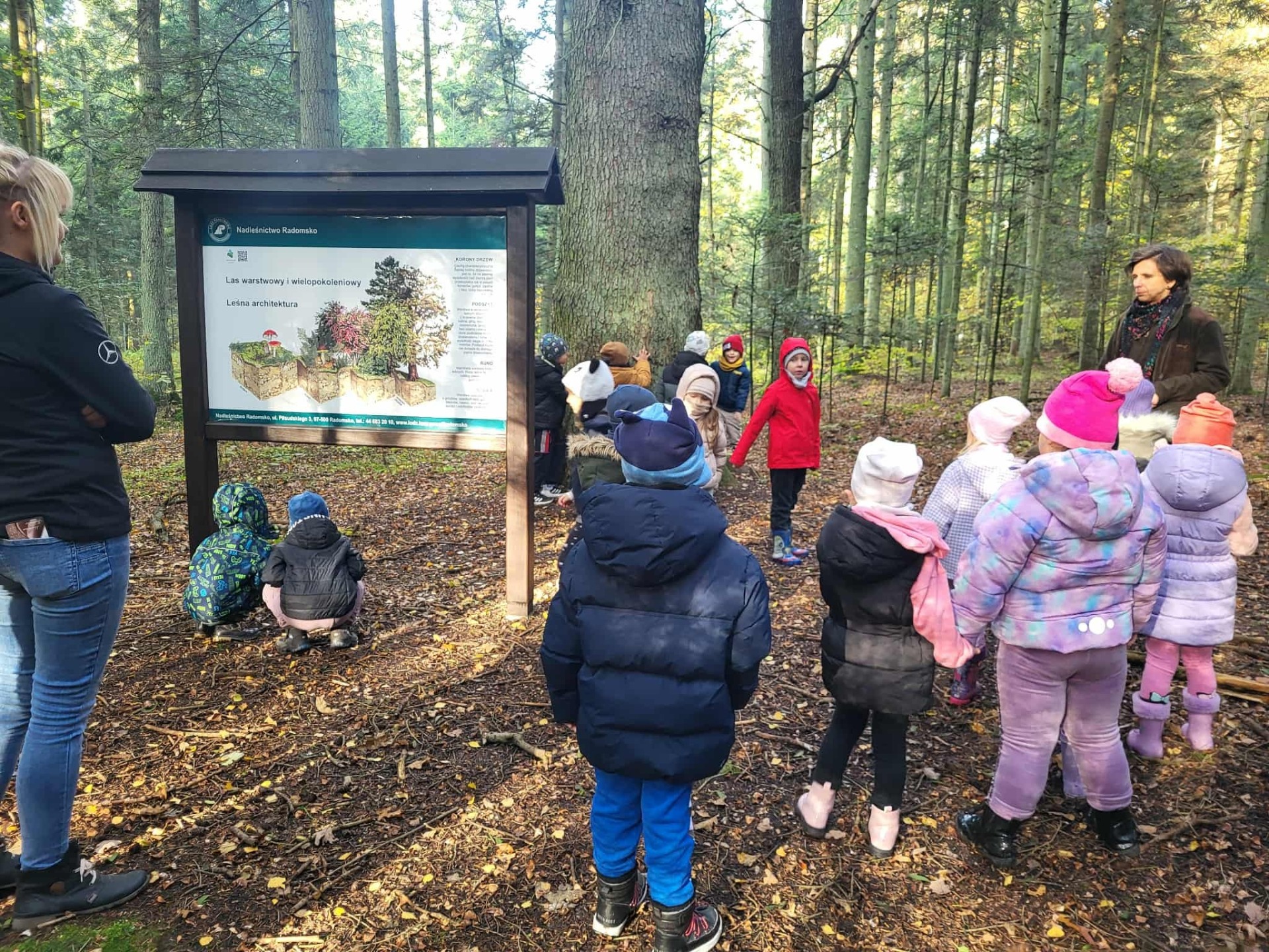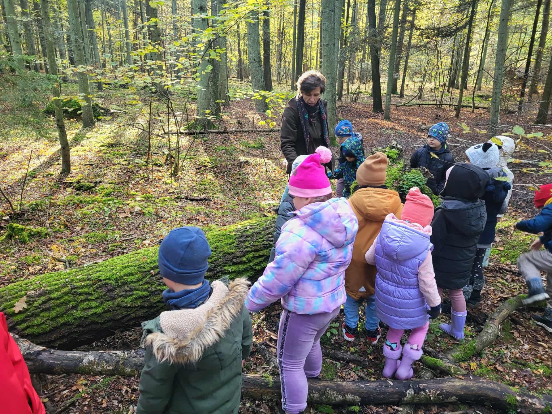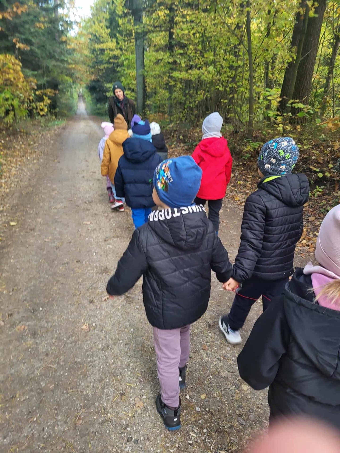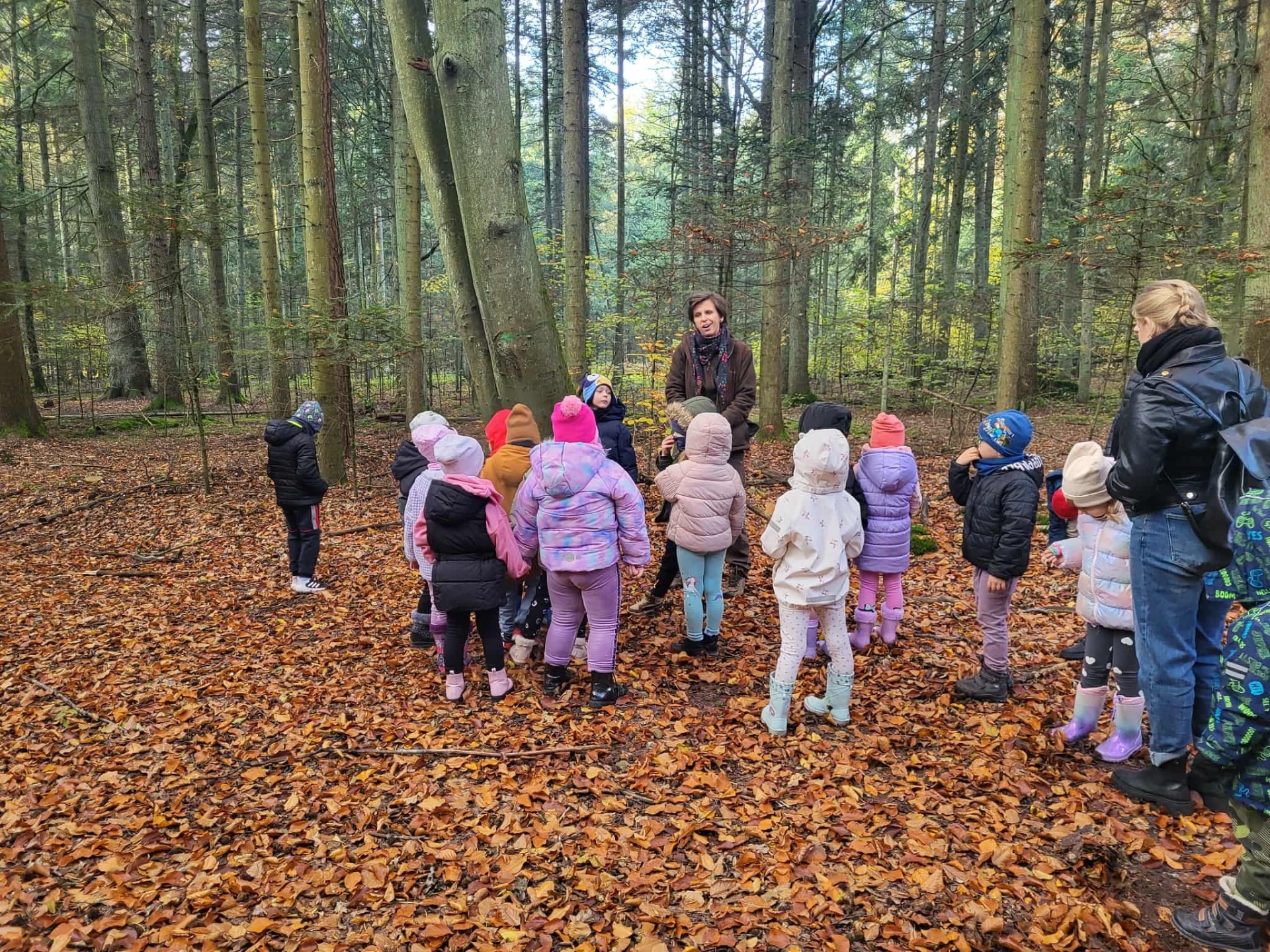 Grupa 5-latków, w aurze pięknej jesiennej pogody wybrała się na wycieczkę do Szkółki Leśnej w Strzałkowie, Przewodnikiem po leśnych ścieżkach była Pani Izabela Randak, edukator z Nadleśnictwa Radomsko, która z ogromną pasją opowiadała o lesie i jego mieszkańcach. Podczas spaceru przedszkolaki obserwowały drzewa, liście na drzewach, zbierały szyszki, wsłuchiwały się w odgłosy natury i poznawały ciekawostki dotyczące życia leśnych zwierząt. Każde nowe odkrycia wywoływało u dzieci wiele pozytywnych emocji. Z ogromnym zainteresowaniem i zaangażowaniem poznawały las , zwracając uwagę na każdy szczegół leśnego krajobrazu jak np. powalony i porośnięty mchem pień drzewa, opadające liście, wiewiórkę skaczącą po drzewach, budkę dla ptaków.