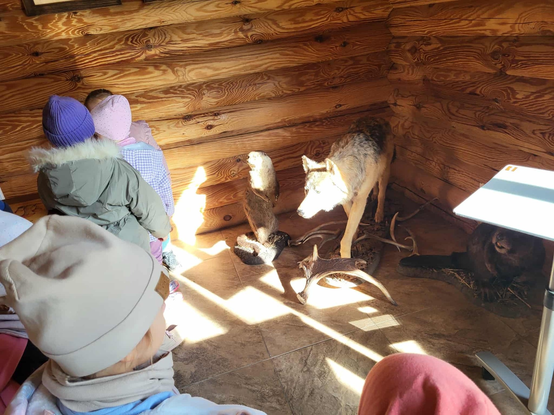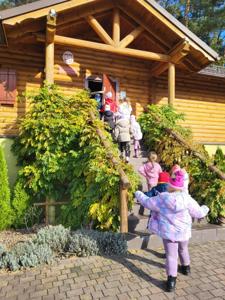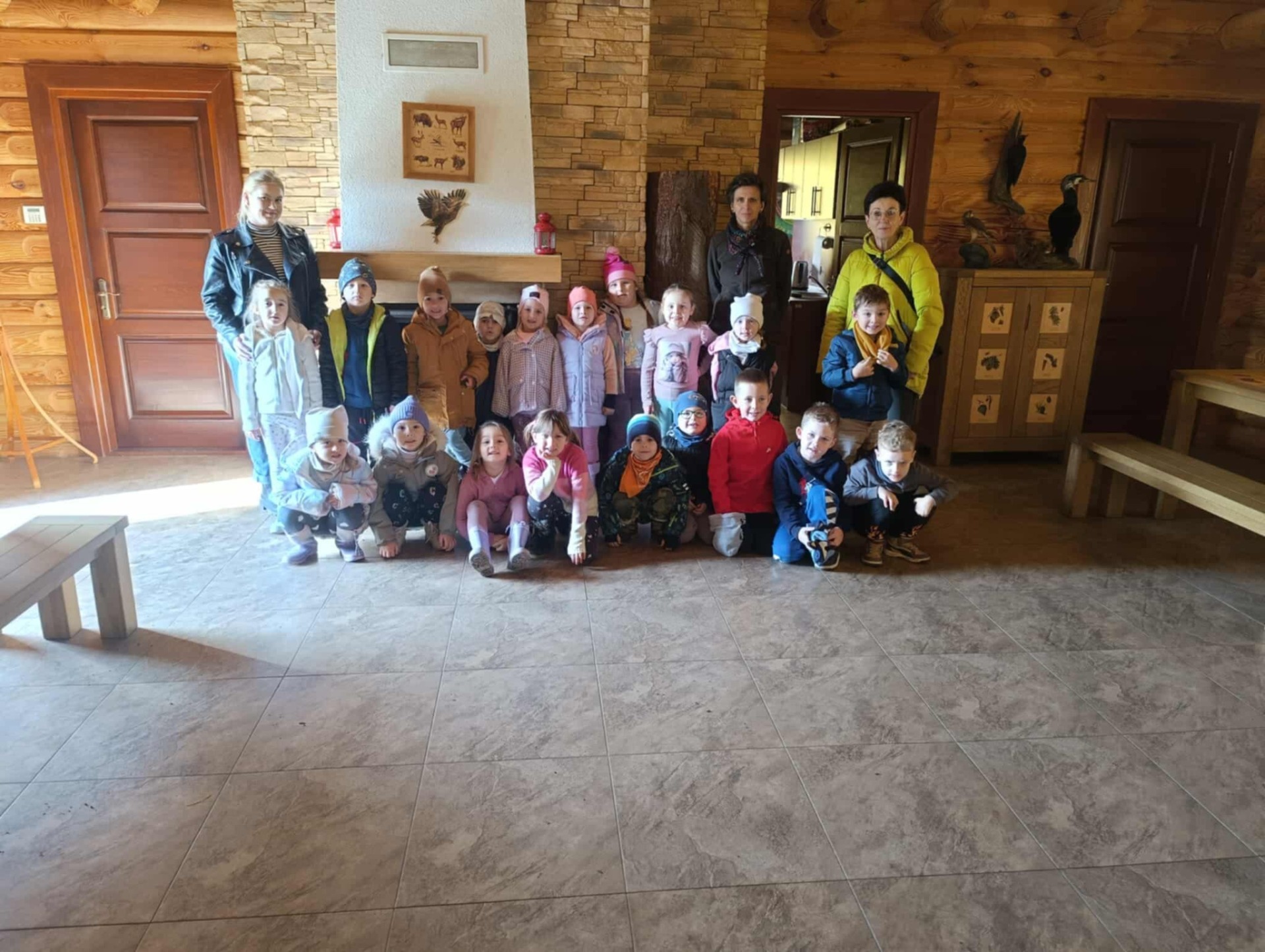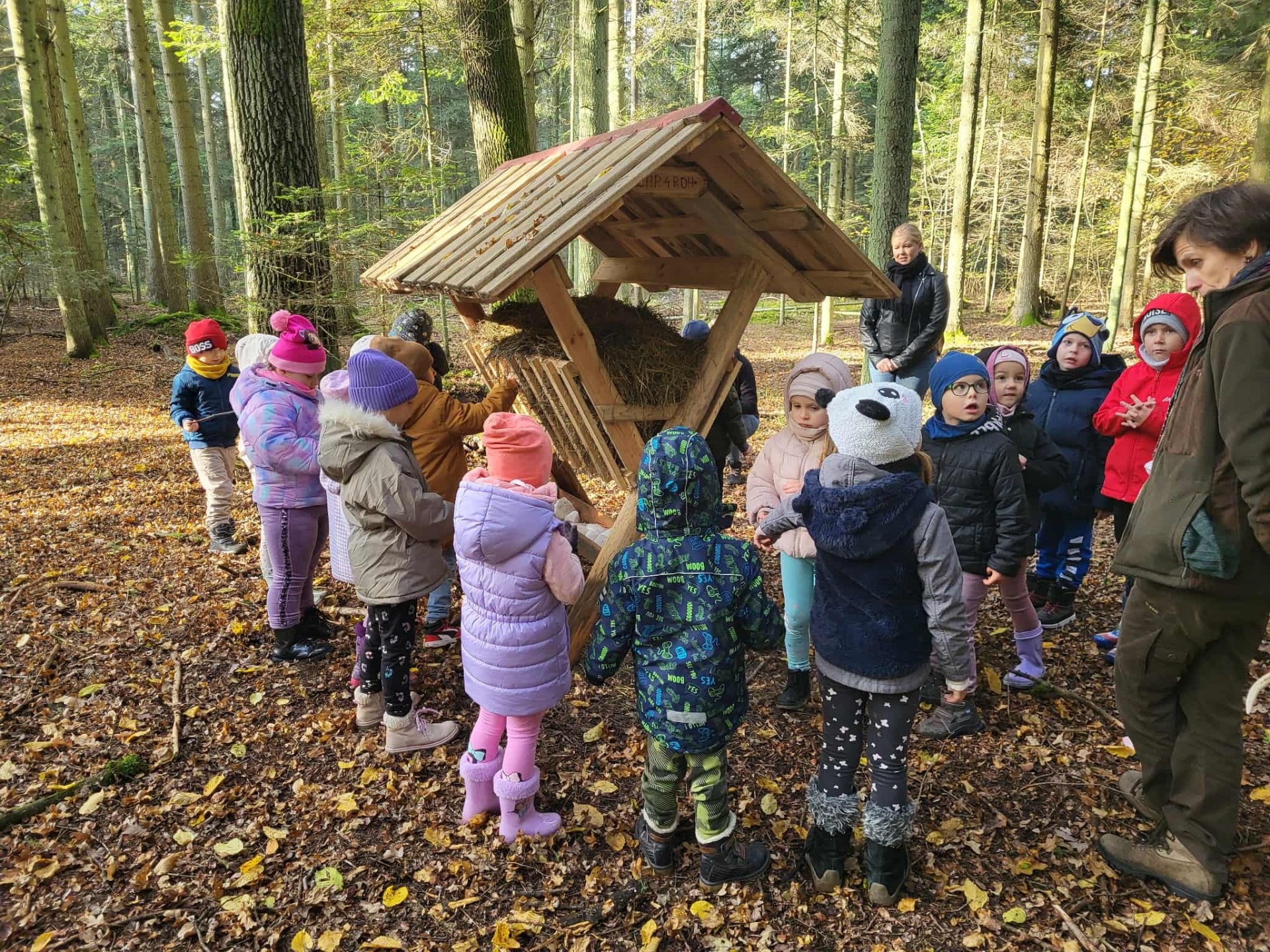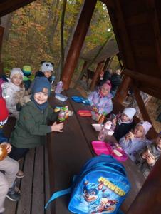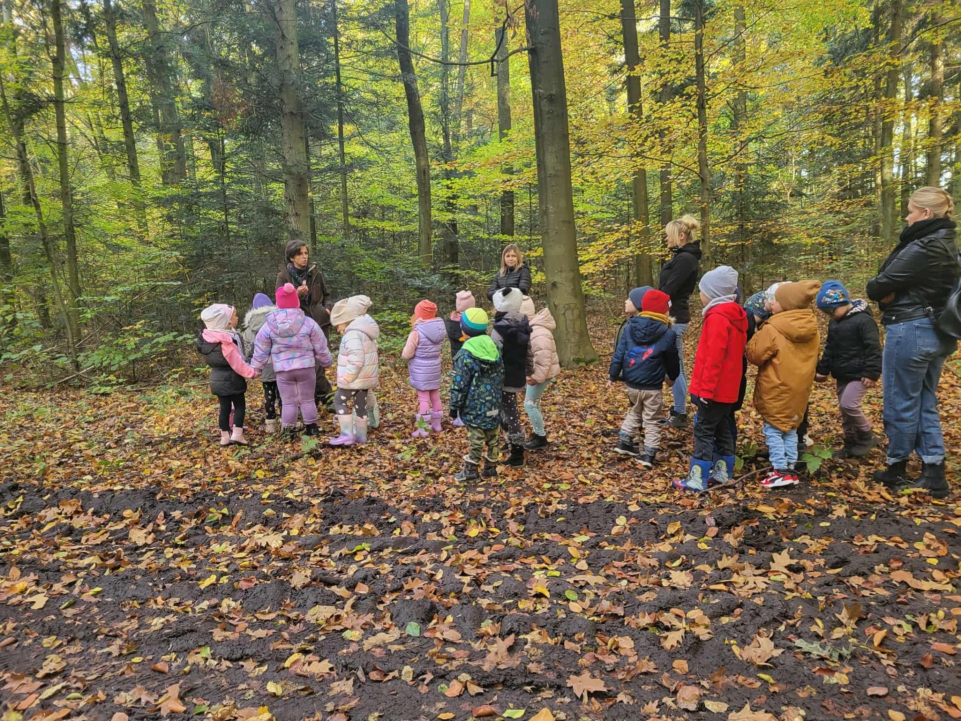 Grupa 5-latków, w aurze pięknej jesiennej pogody wybrała się na wycieczkę do Szkółki Leśnej w Strzałkowie, Przewodnikiem po leśnych ścieżkach była Pani Izabela Randak, edukator z Nadleśnictwa Radomsko, która z ogromną pasją opowiadała o lesie i jego mieszkańcach. Podczas spaceru przedszkolaki obserwowały drzewa, liście na drzewach, zbierały szyszki, wsłuchiwały się w odgłosy natury i poznawały ciekawostki dotyczące życia leśnych zwierząt. Każde nowe odkrycia wywoływało u dzieci wiele pozytywnych emocji. Z ogromnym zainteresowaniem i zaangażowaniem poznawały las , zwracając uwagę na każdy szczegół leśnego krajobrazu jak np. powalony i porośnięty mchem pień drzewa, opadające liście, wiewiórkę skaczącą po drzewach, budkę dla ptaków.