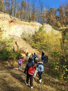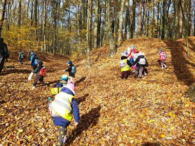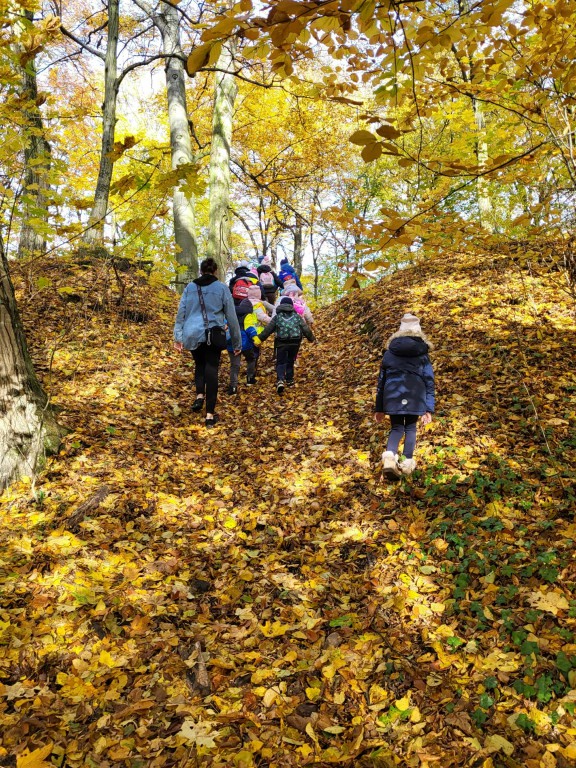 Podczas spaceru mali odkrywcy dowiedzieli się również, że na szczycie Góry Chełmo znajdują się ślady dawnego grodziska, które świadczą , że już setki lat temu ludzie budowali tu swoje osady i bronili się przed wrogami. Dzieci z ciekawością oglądały teren, próbując dostrzec pozostałości dawnych umocnień..