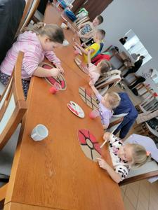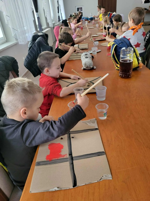Na zakończenie wędrówki w budynku Filii GOKiS w Zagórzu zostały zorganizowane dla dzieci zajęcia plastyczne. Tam, z ogromnym zaangażowaniem wykonywały akcesoria wyposażenia stroju każdego rycerza czyli miecz i tarczę.