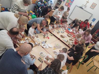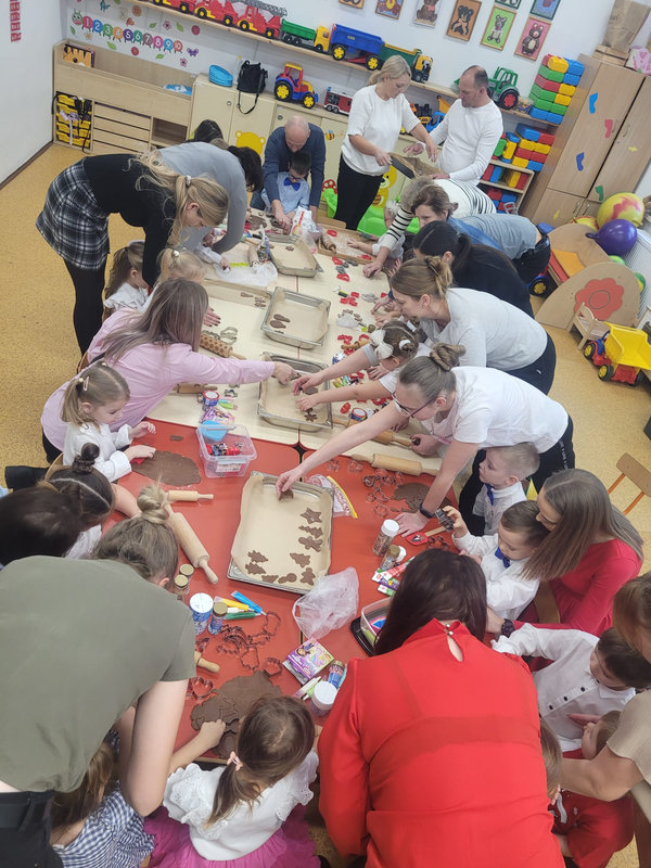 Następnie przedszkolaki, wspólnie z rodzicami, przystąpiły do przygotowywania pierniczków. Wałkowanie ciasta, wykrawanie świątecznych kształtów oraz późniejsze ozdabianie upieczonych pierników kolorowym lukrem i posypkami sprawiło wszystkim wiele radości.