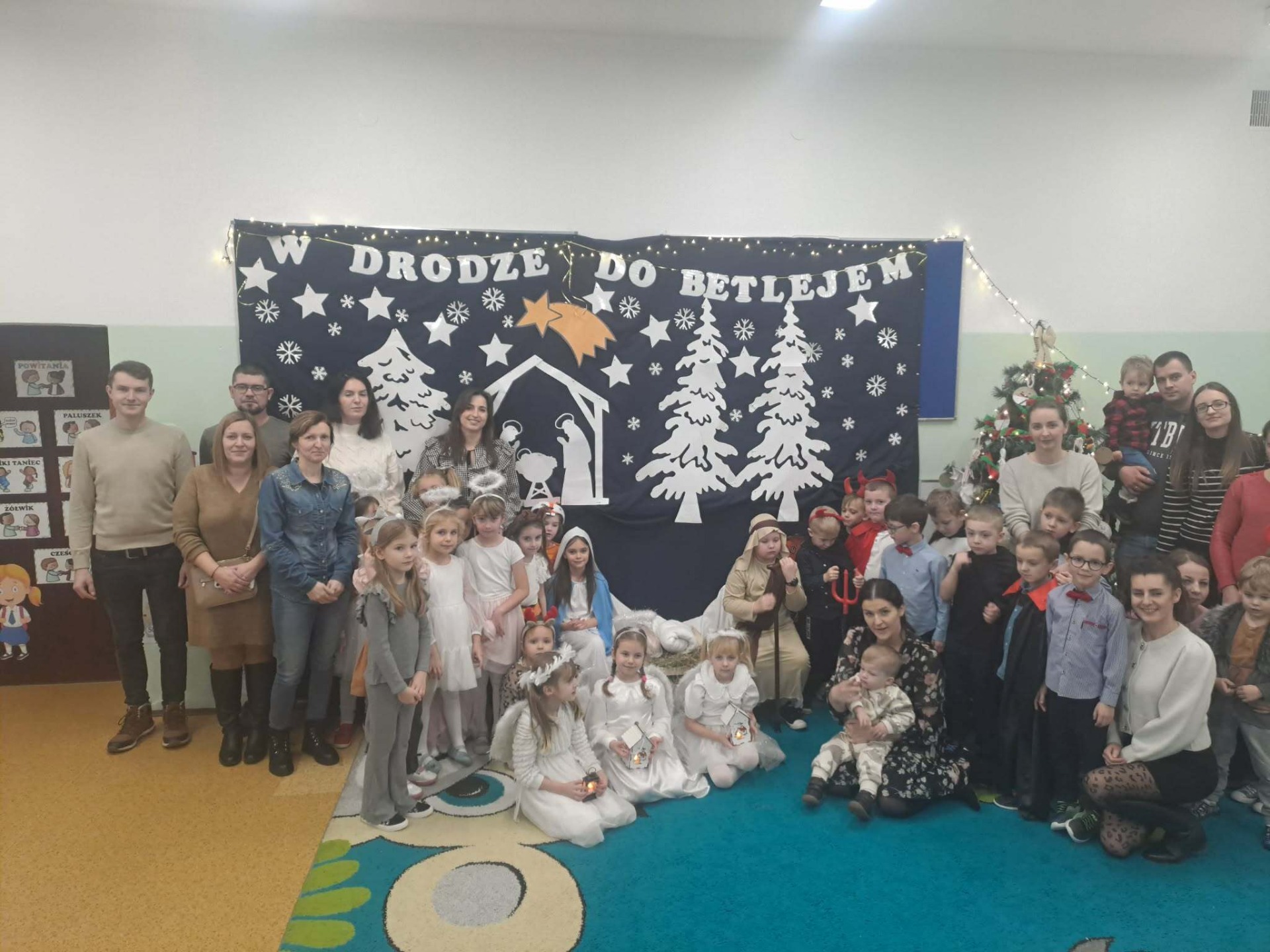 Mali aktorzy wcielili się w swoje role z dużym zaangażowaniem, recytując swoje role, śpiewając kolędy i pastorałki oraz wykonując układy taneczne. Scenografia nawiązywała do zimowego lasu i stajenki, a starannie przygotowane stroje podkreślały wyjątkowy charakter przedstawienia. Występ dzieci spotkał się z ciepłym i entuzjastycznym przyjęciem ze strony rodziców oraz gości, którzy nagrodzili małych aktorów gromkimi brawami. Jasełka były dla przedszkolaków cennym doświadczeniem – pozwoliły im przełamać nieśmiałość, rozwijać umiejętność współpracy oraz publicznych wystąpień. Przedstawienie dostarczyło wszystkim wielu wzruszeń i radości, a także wprowadziło zgromadzonych w atmosferę Świat Bożego Narodzenia. Dziękujemy rodzicom za zaangażowanie i przygotowanie kostiumów. Wesołych Świąt!